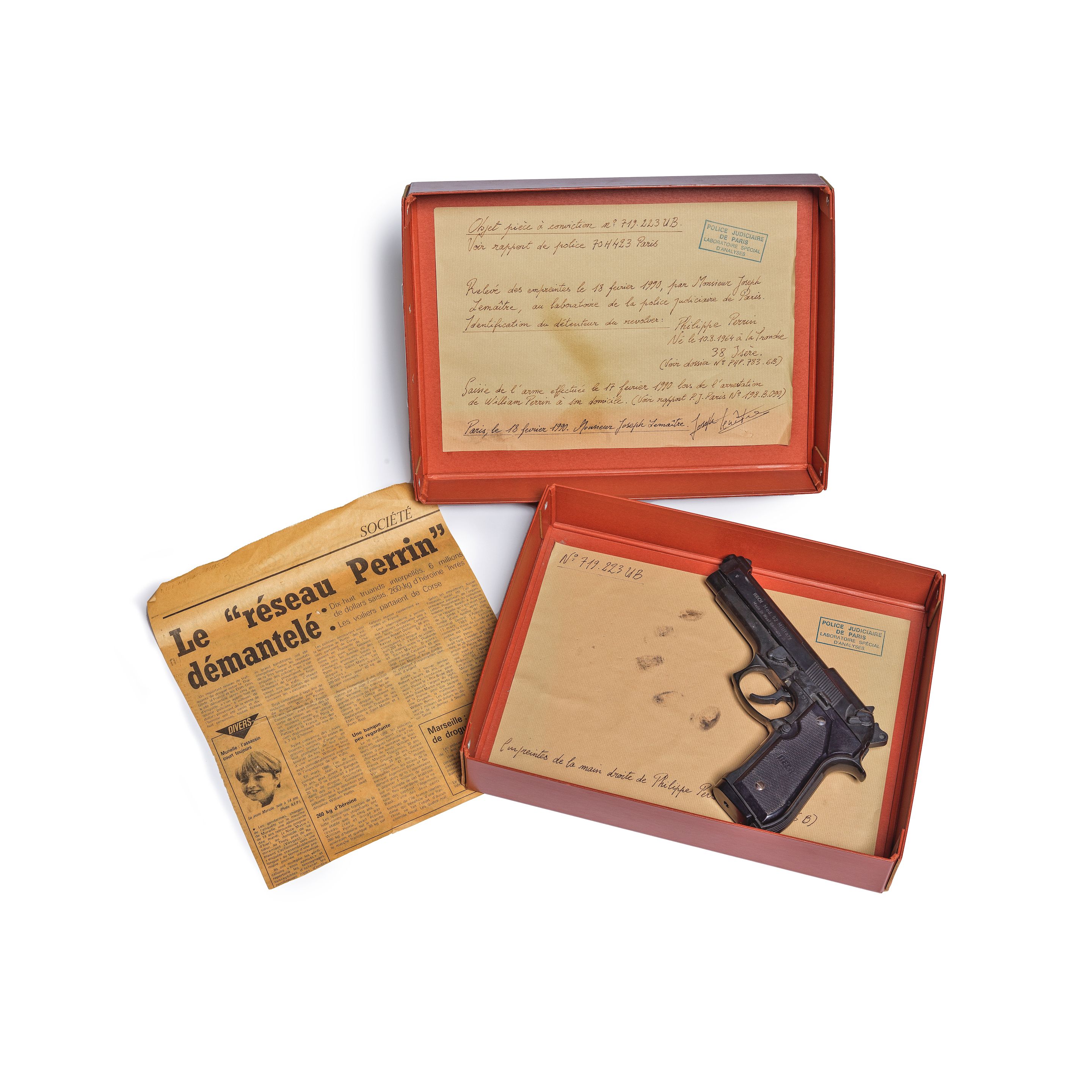 arme type Beretta (factice), article de Nice Matin «le réseau Perrin démantelé» , encre et poudre sur documents, boîte cartonnée
