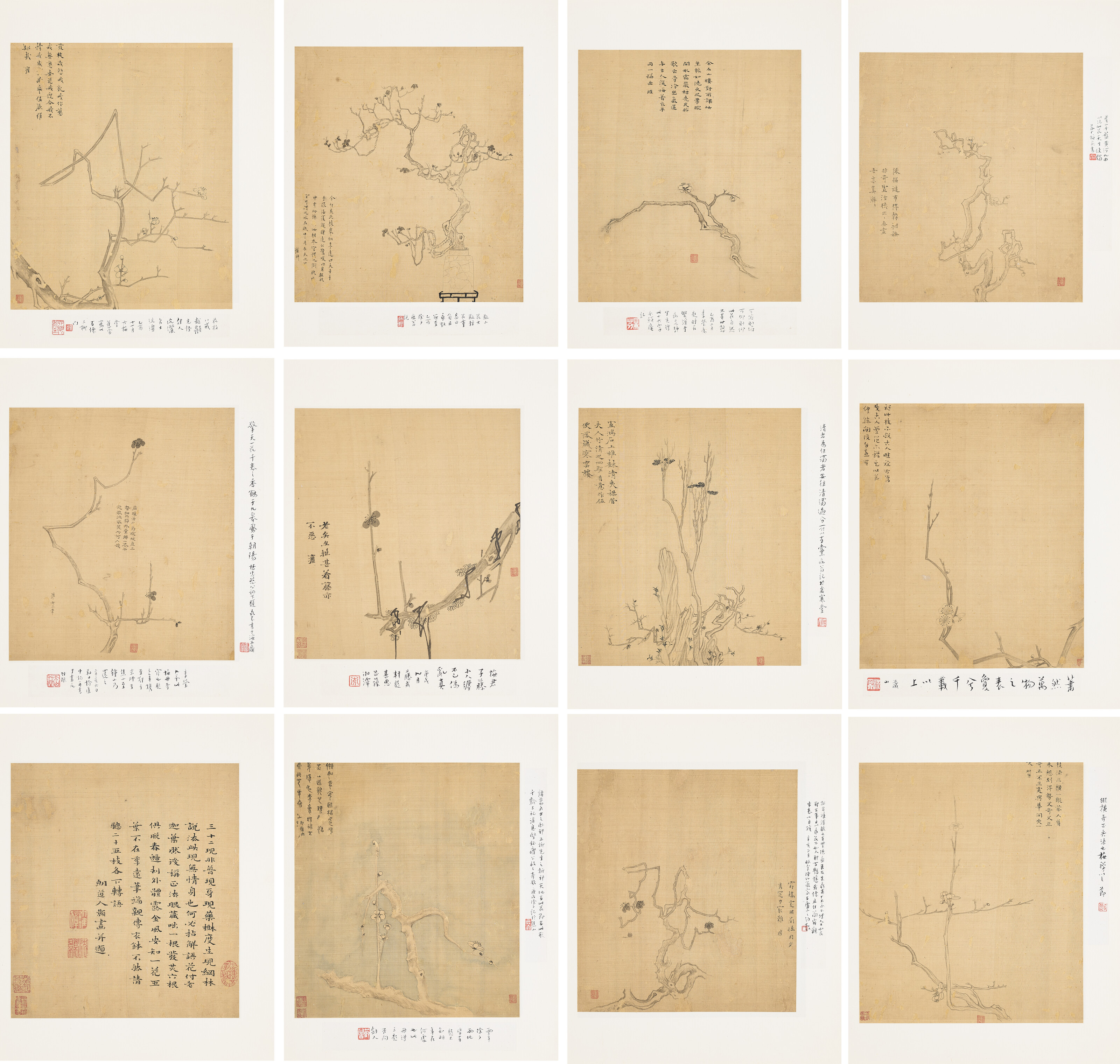 A set of three scrolls, mounted and framed, ink and colour on paper