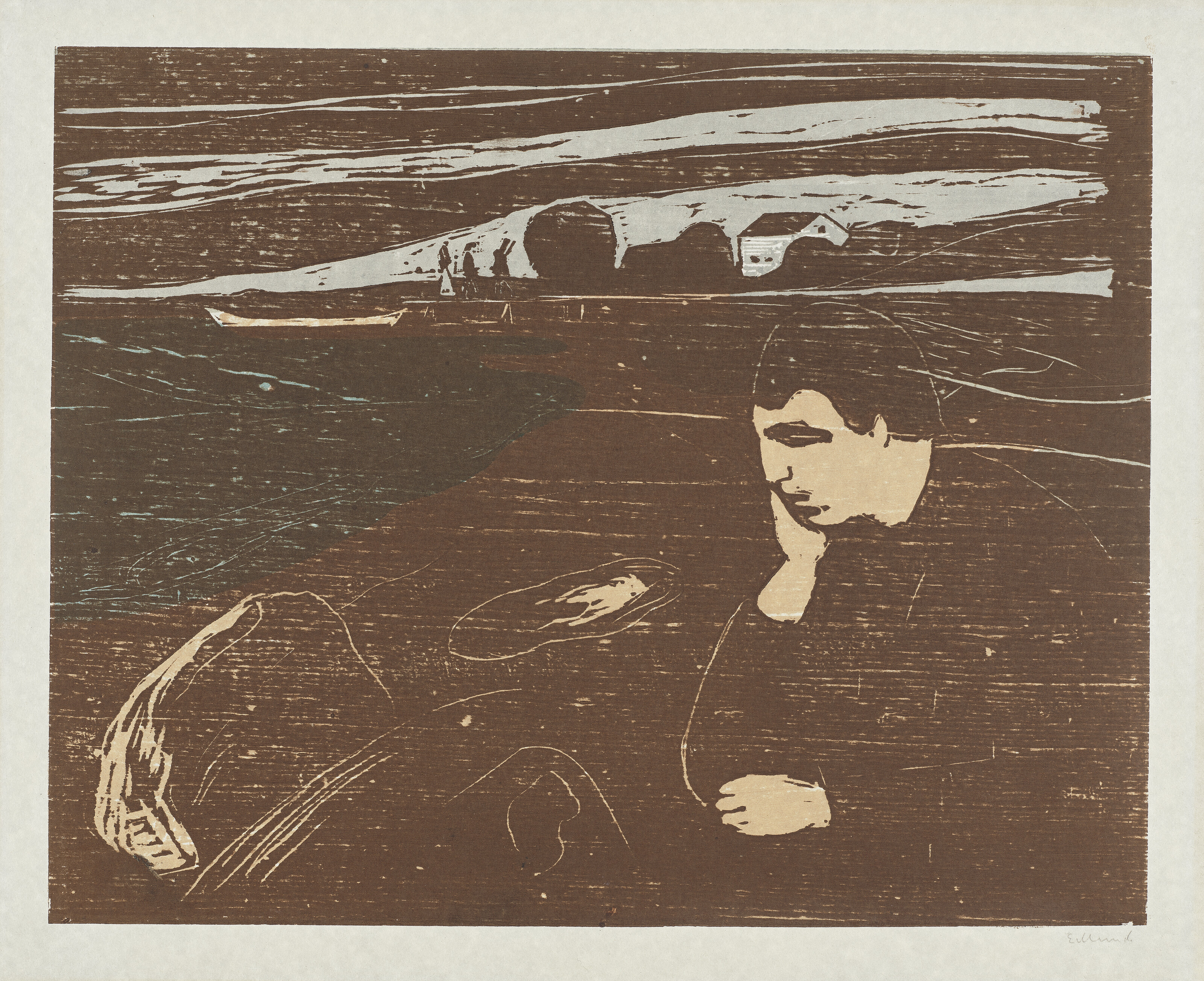 woodcut printed from two blocks in brown, pale ochre, bluish-grey and turquoise