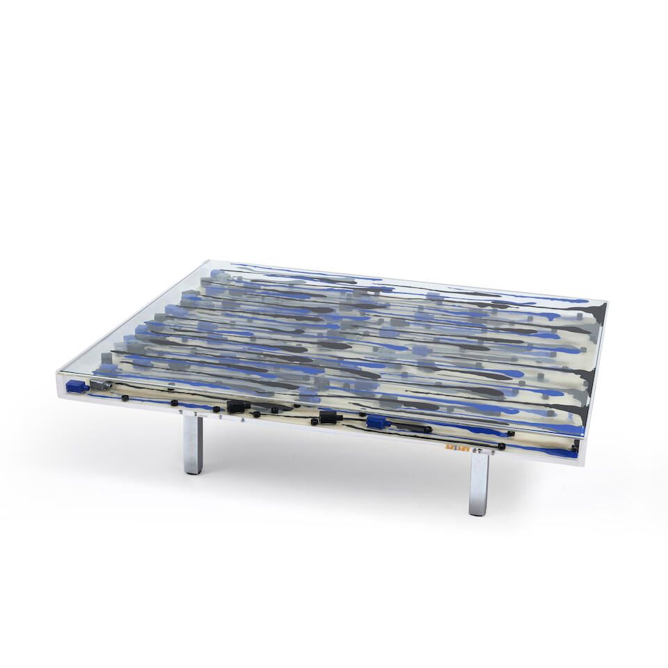 Sérigraphie, plexiglas, accumulation de pots en verre de peinture acrylique et métal