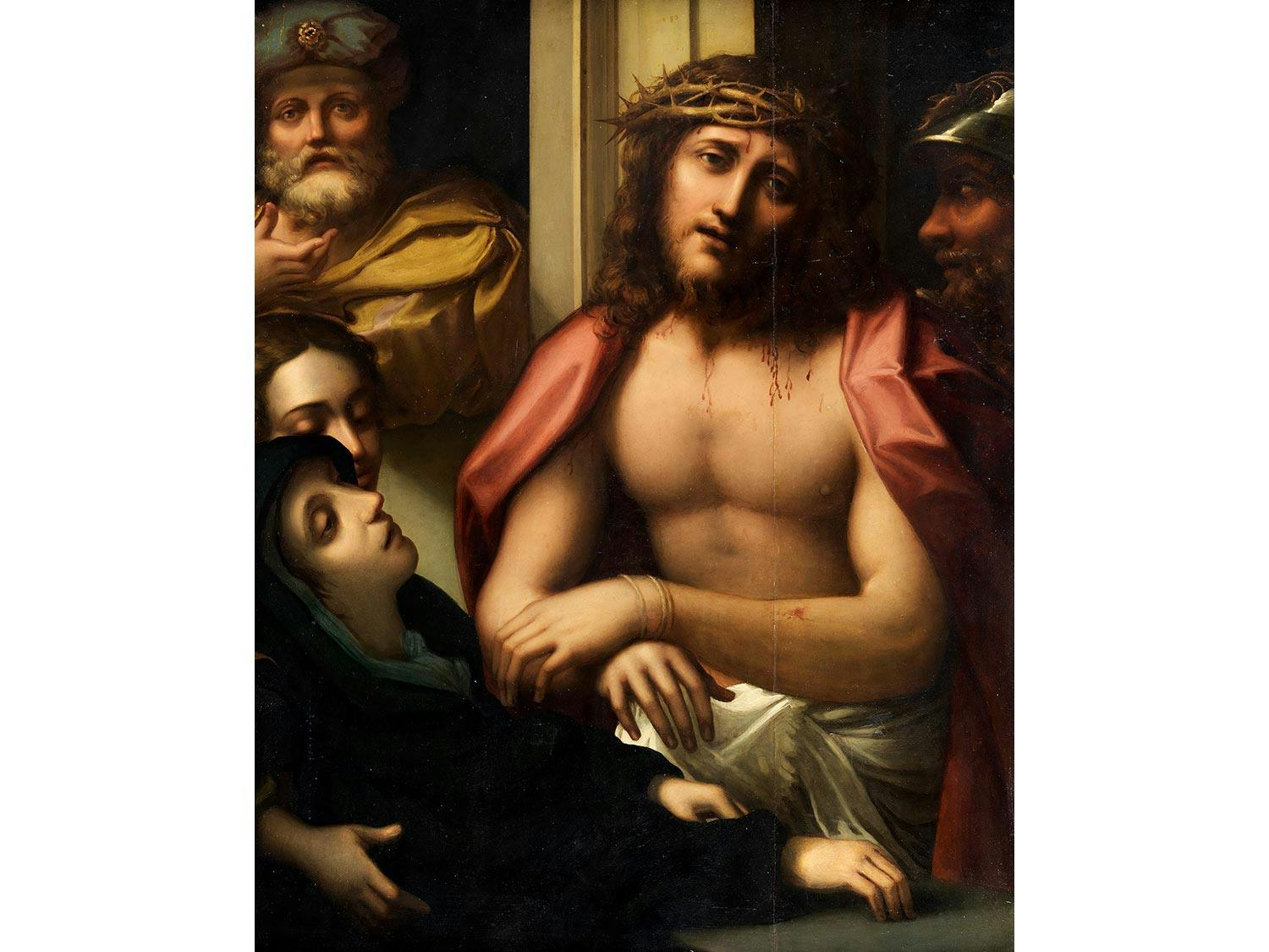 Oil on panel. Partially parquetted.