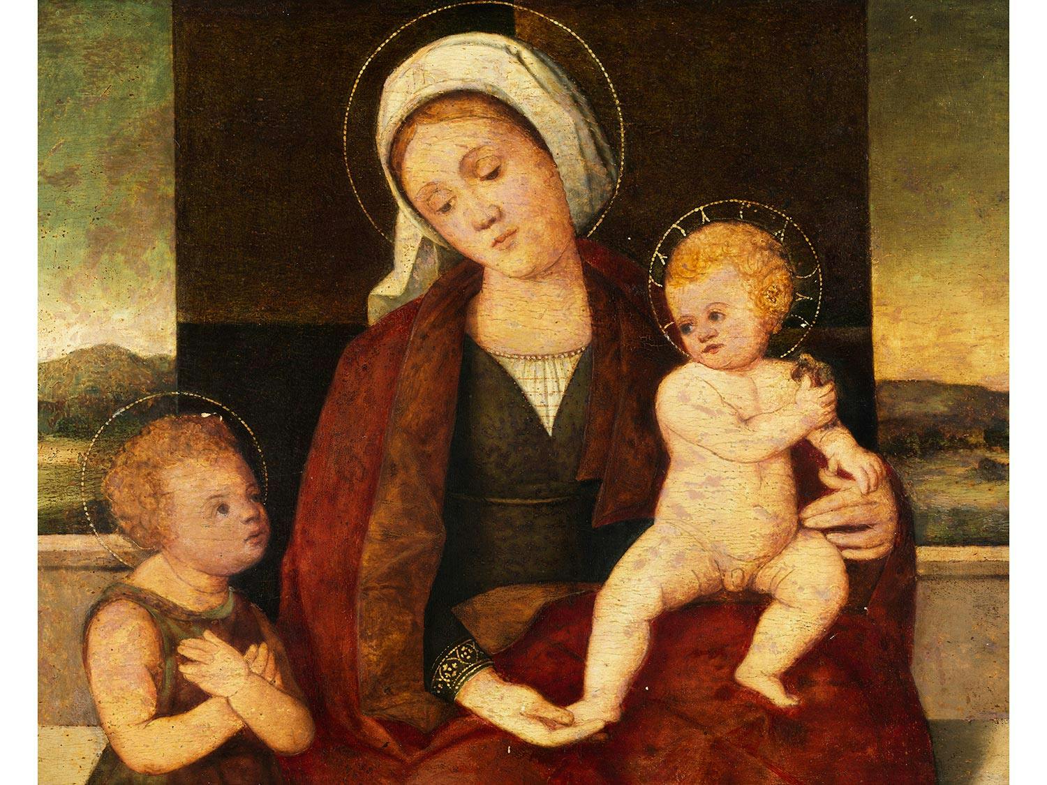 Das vorliegende Gemälde, welches wir mit dem gleichen Titel versehen haben, wie dasjenige in den Uffizien in Florenz, da auch hier die Buchseite mit dem durch eine polychrom gestaltete Majuskel „M“ dekorierten Magnificat beginnt. Es stimmt in weiten Teilen mit dem etwas größeren Florentiner Vorbild überein, zeigt sich jedoch in einer weicher verstandenen, weniger der zeichnerischen, kontrastreichen unterlaufenen Auffassung der Malerei. Wir kennen die Umstände unter denen die Original Tafel in Auftrag gegeben wurde nicht, aber die kreisförmige Form des Gemäldes lässt uns an eine Arbeit denken, die für die private Andacht gefertigt wurde. Die im Tondo dargestellte Szene zeigt Maria gekrönt von zwei Engeln, während sie damit beschäftigt ist, ein Buch über eine Passage aus dem Lukasevangelium zu schreiben „Magnificat anima mea Dominum“. Das Jesuskind sitzt auf ihrem Schoß und führt ihre schreibende Hand. Andere Engel halten das Buch und das Tintenfass und eine andere geflügelte Figur befindet sich hinter den beiden. Die Komposition passt sich perfekt der Form des Bildes an, indem sie die Augen des Betrachters auf das Buch und auf die Hände von Maria und Jesus zusammenführt. Im Hintergrund ein sich in den hügeligen Grund windender Wasserlauf und Architekturstaffage. Rest.