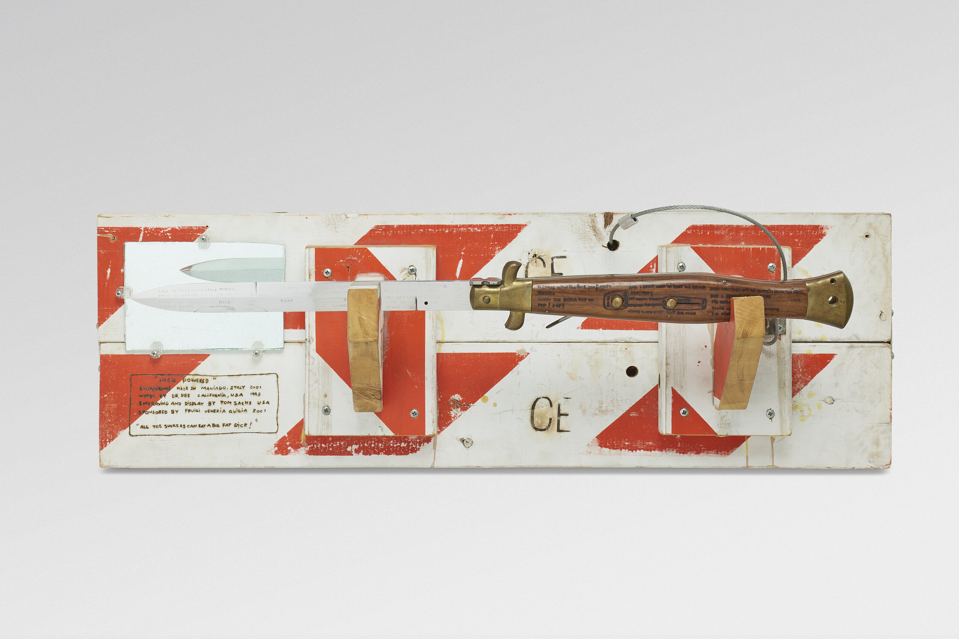 bois peint, vis, miroir, plastique, fil de fer, plaques de métal et couteau