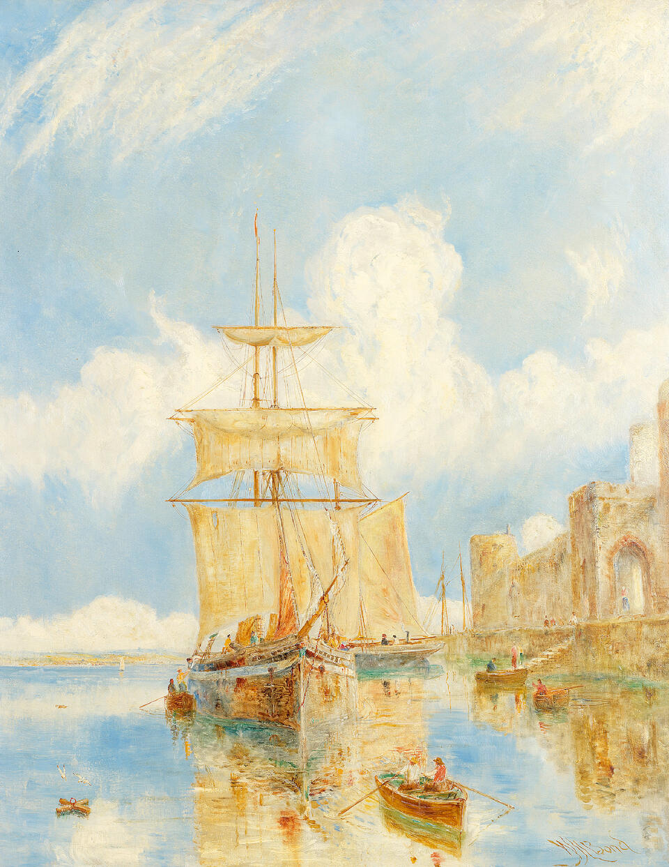 Twin masted ship off a castle