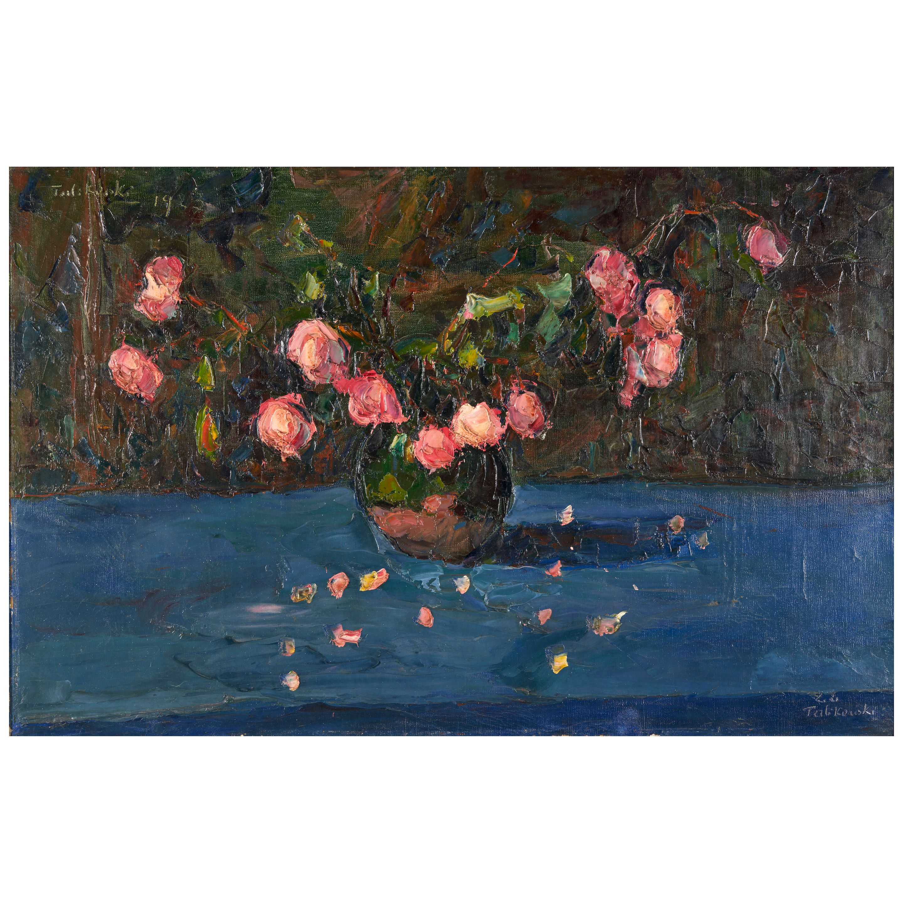 Fading Pink Roses on Blue Cloth