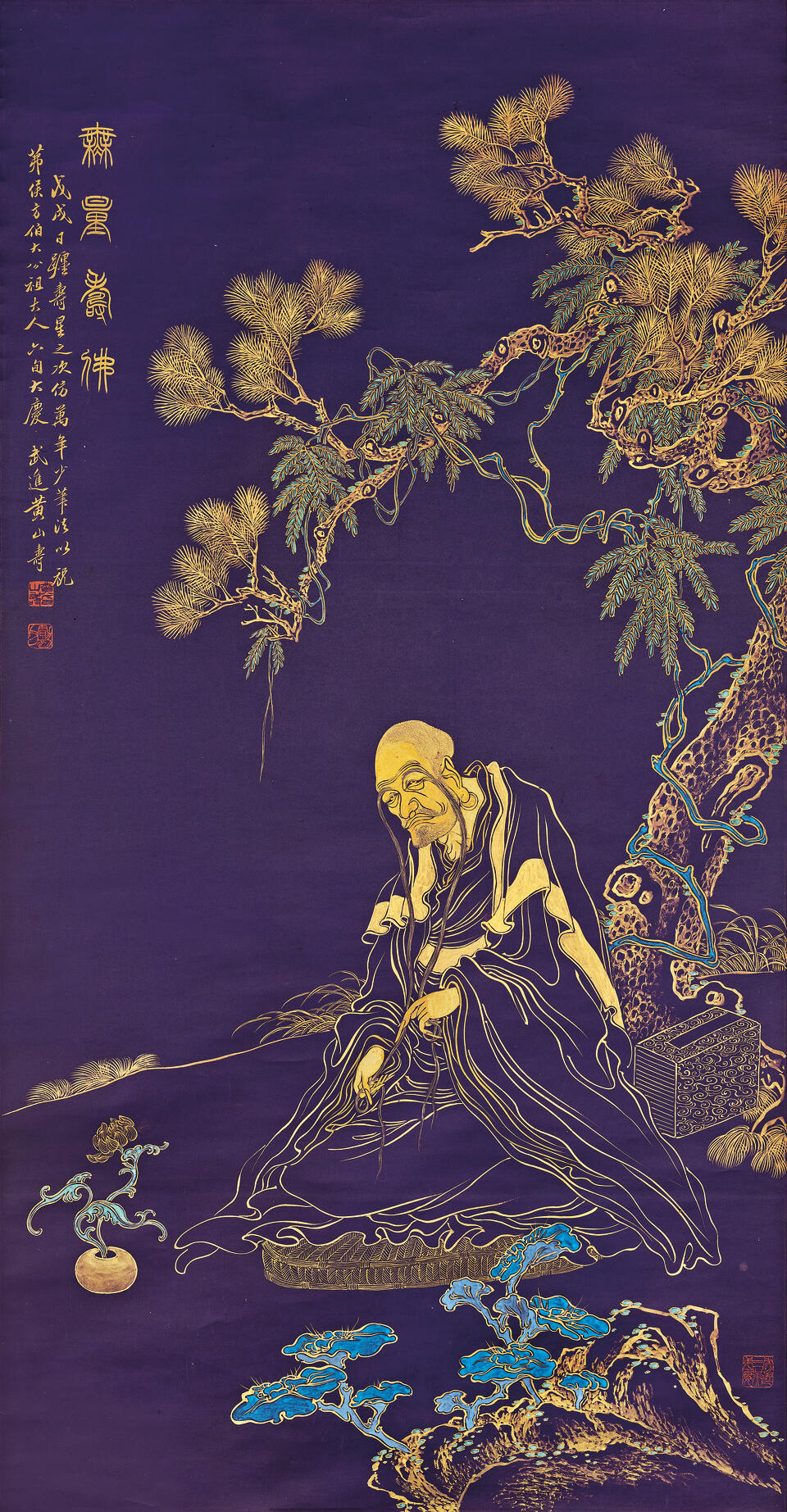 Gold on blue paper, hanging scroll