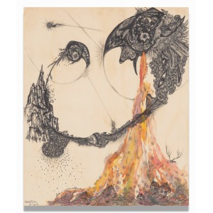 Watercolor, pen and pencil on paper mounted on panel