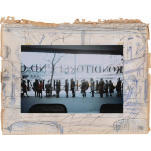 Colored pencil, photograph, acrylic plate, bolt and paper on board