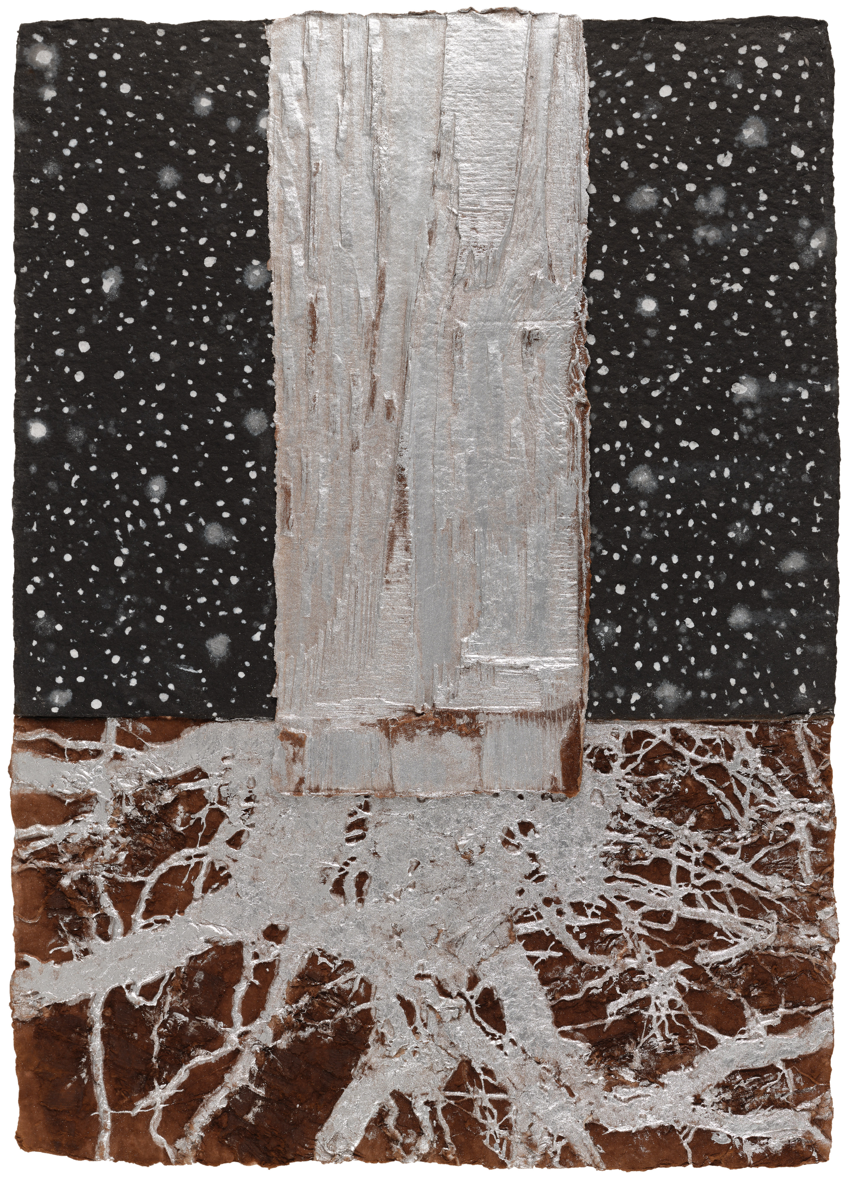 Pigmented and printed handmade paper in colors with collage and silver ink, the full sheet
