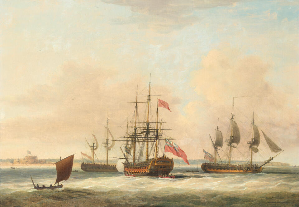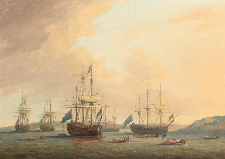 A Royal Navy 'Squadron of the Blue' lying at anchor, with naval officers, i...