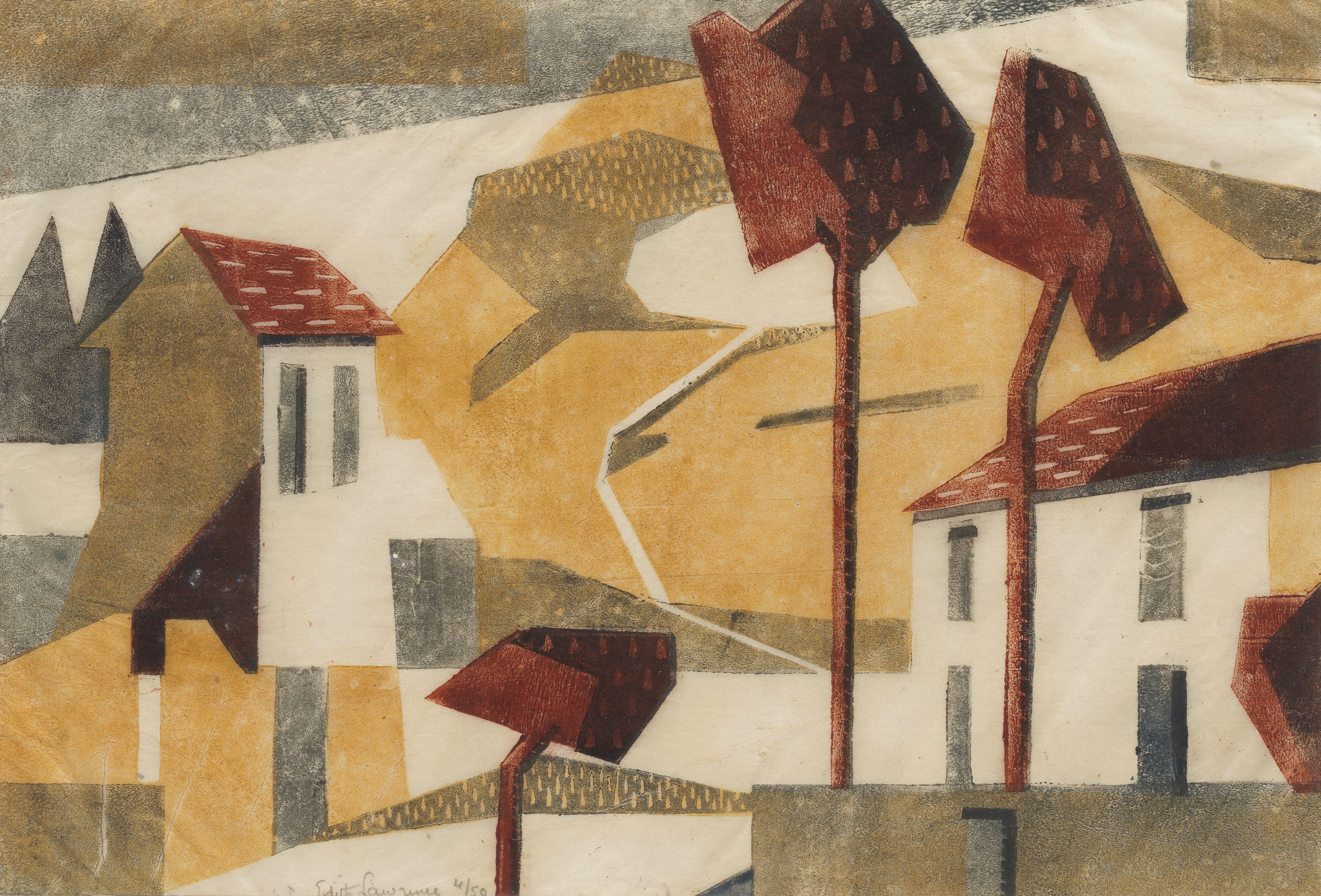 Linocut in colours, circa 1929, on tissue-thin oriental laid paper, a fine, richly inked impression
