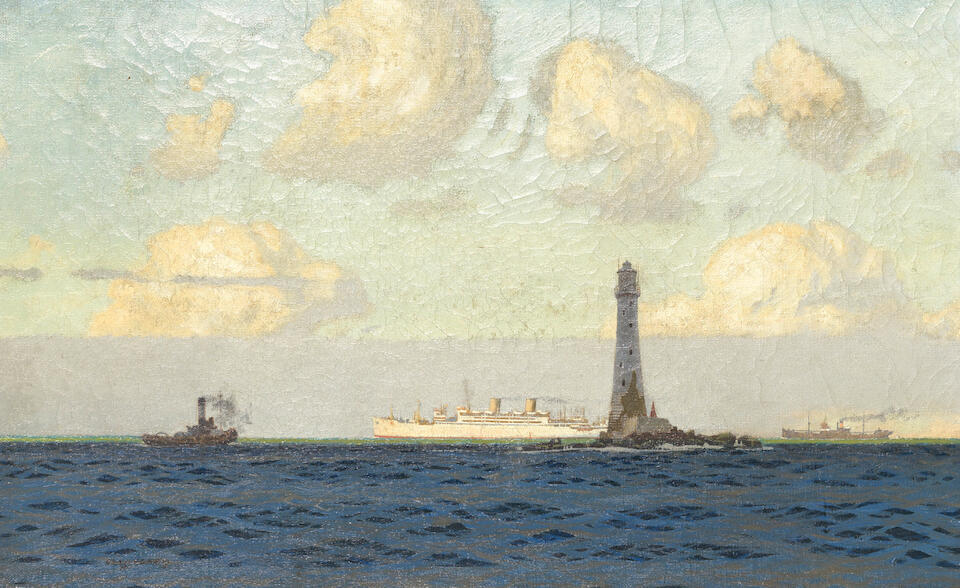 The Wolf Rock Lighthouse with shipping in the distance