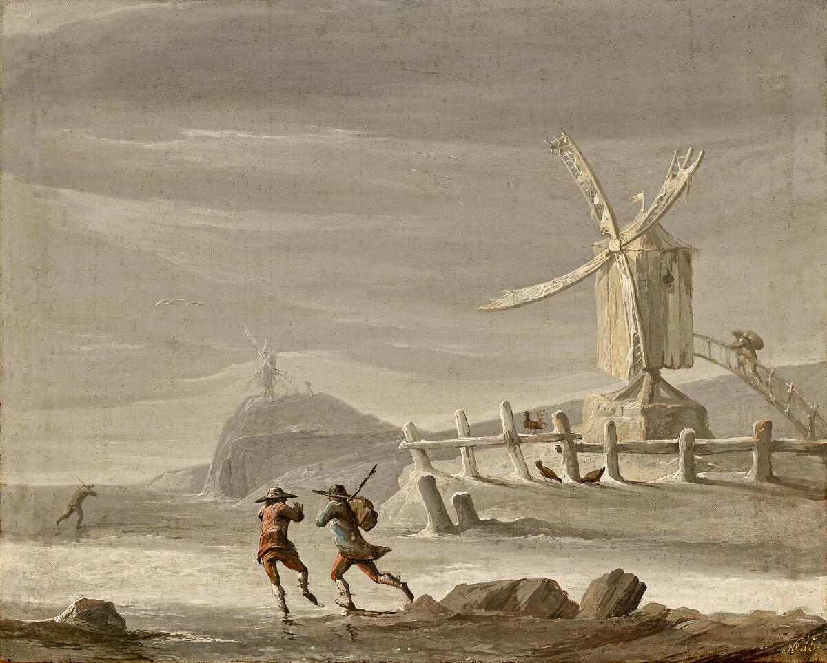 A winter day with ice skaters on a frozen lake