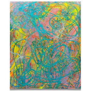 Acrylic, glitter, glass and spray on canvas mounted on panel