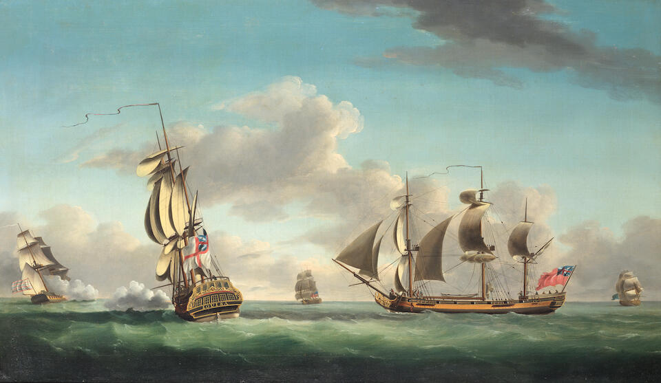 The British man of war Louisa engaging the American privateer Cato with oth...