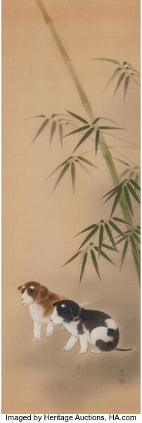 Attributed to Takasu Ryuko (Japanese, 1810-1858), Puppies, ink and color on...