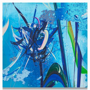 Acrylic, resin, splay paint and UV print on wood panel