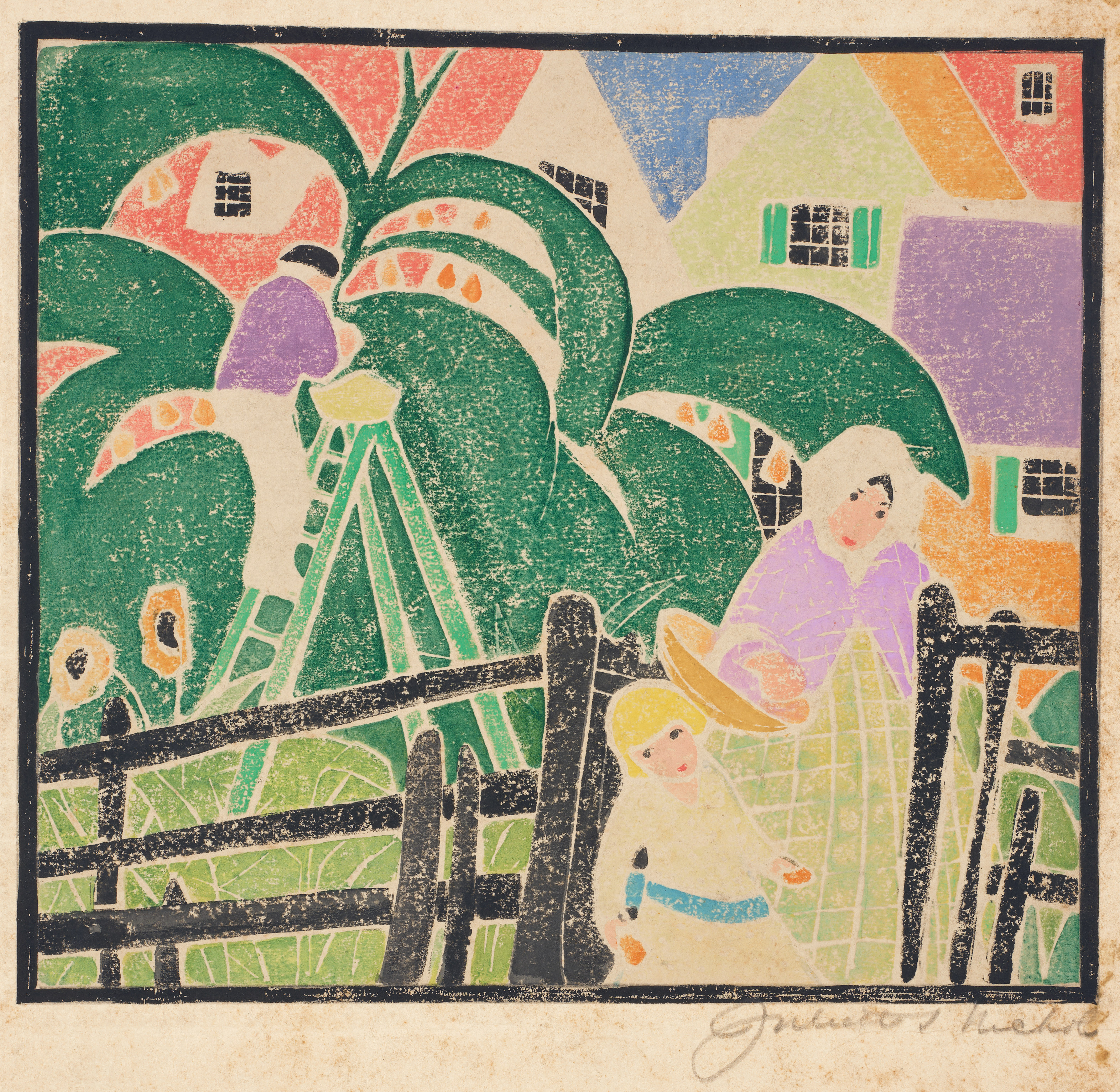 Unique white-line woodcut in colors with hand-coloring and graphite, on wove paper, with margins