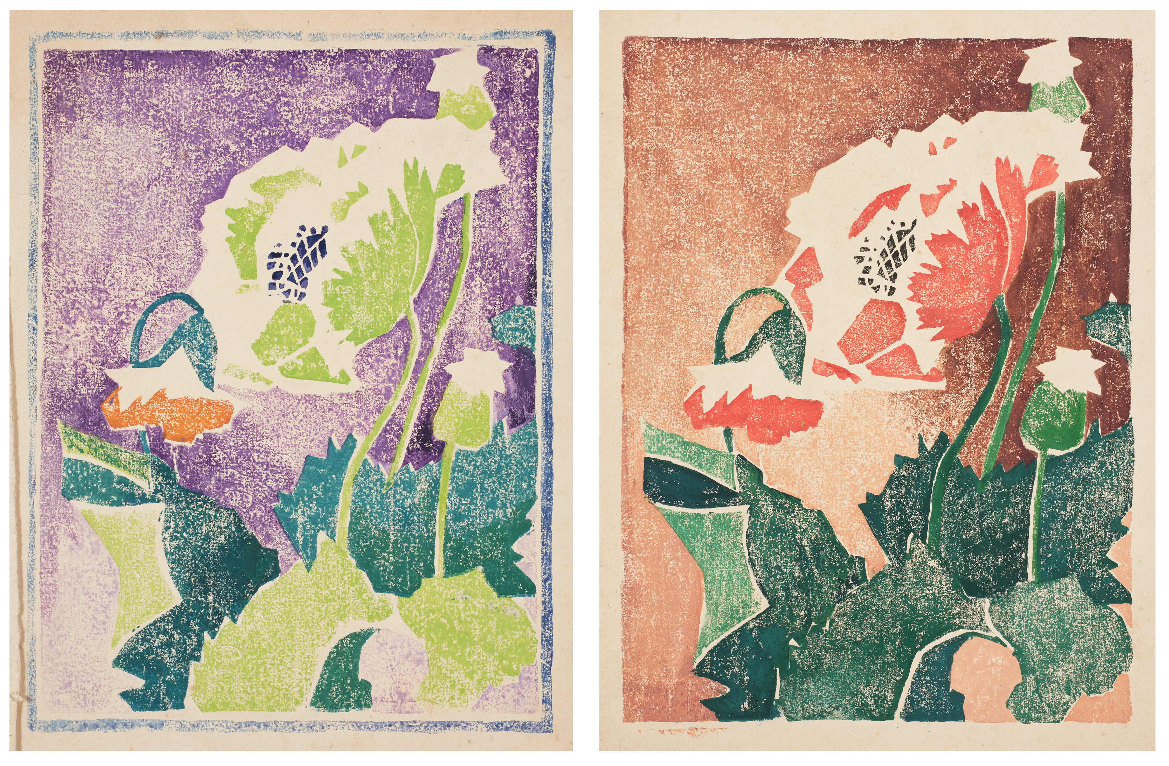 Two unique white-line woodcuts in colors, on laid paper, with margins