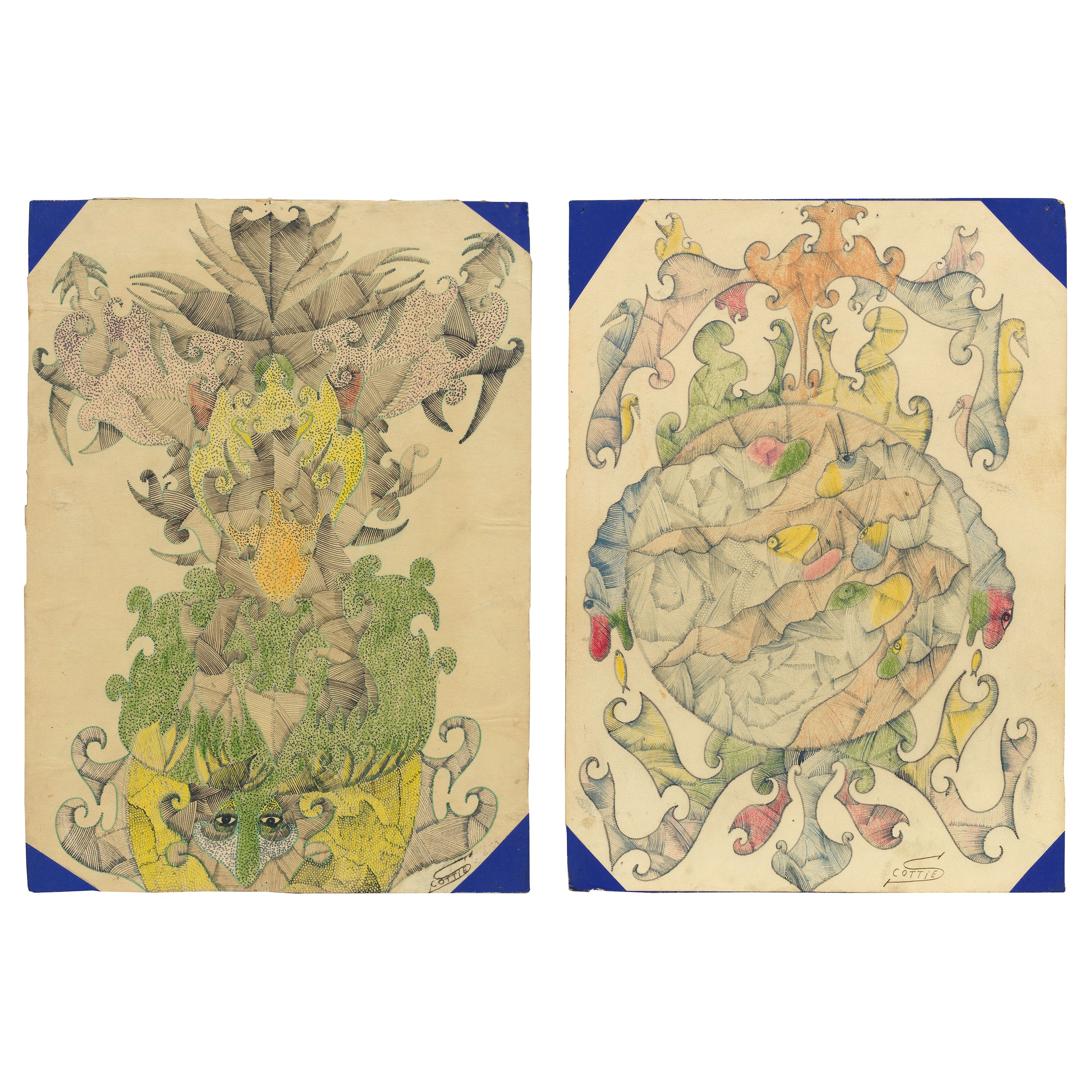 pen and ink and crayon on paper, laid on card