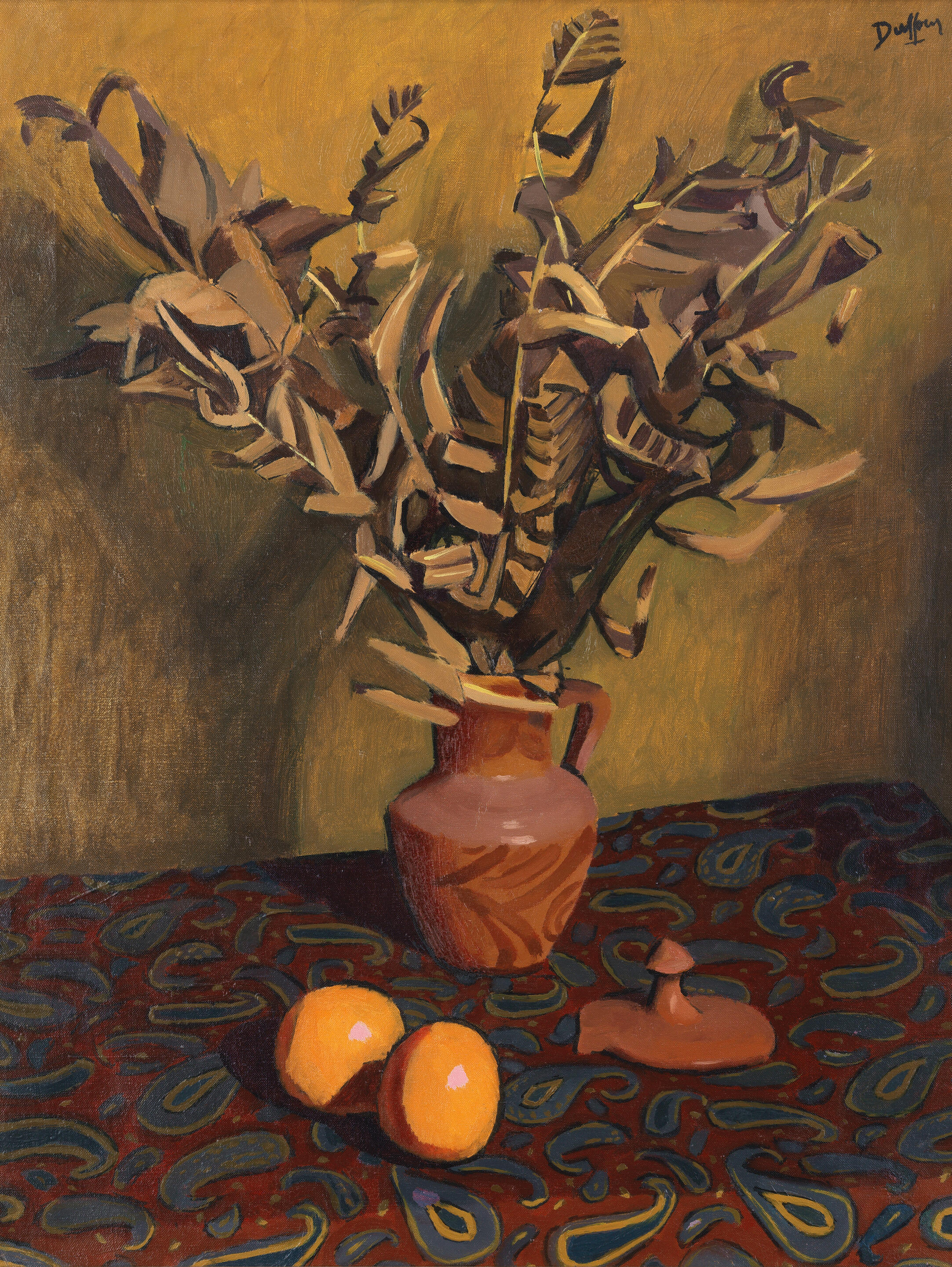 Still life with dried foliage in a vase and oranges
