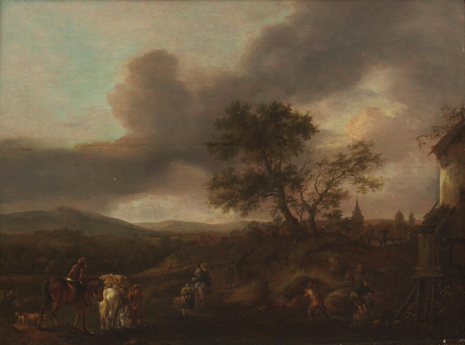 Paysage étendu avec des voyageurs sur une route et des figures pêchant à...