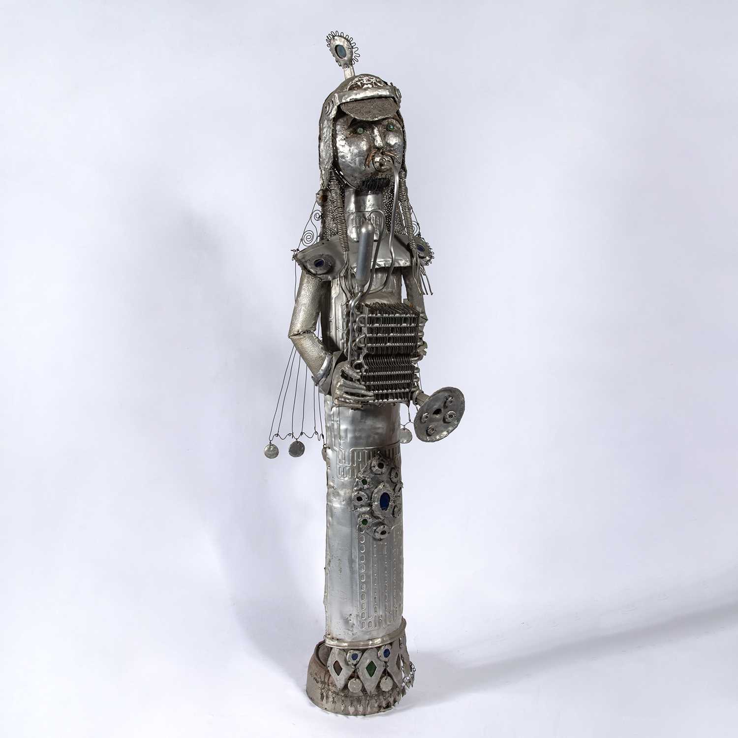 Mixed media including leather, steel wire, sand, and acrylic on wood