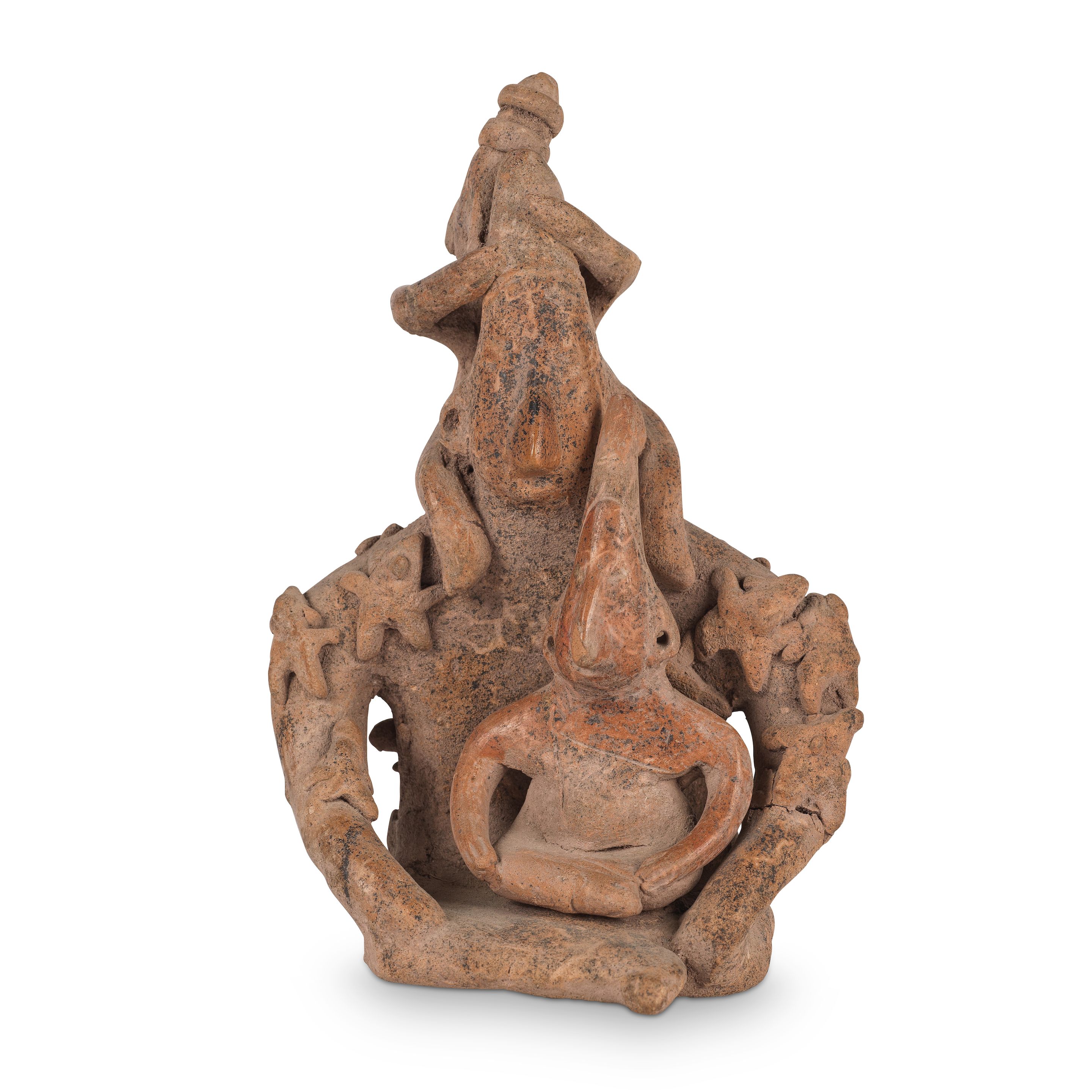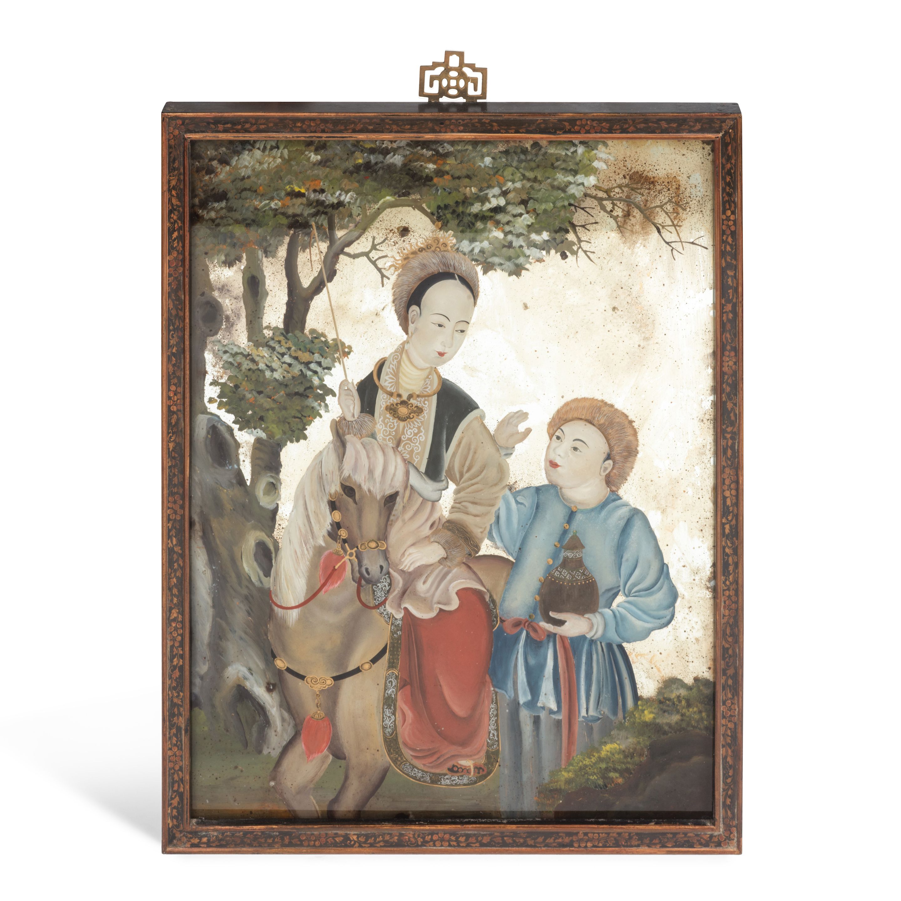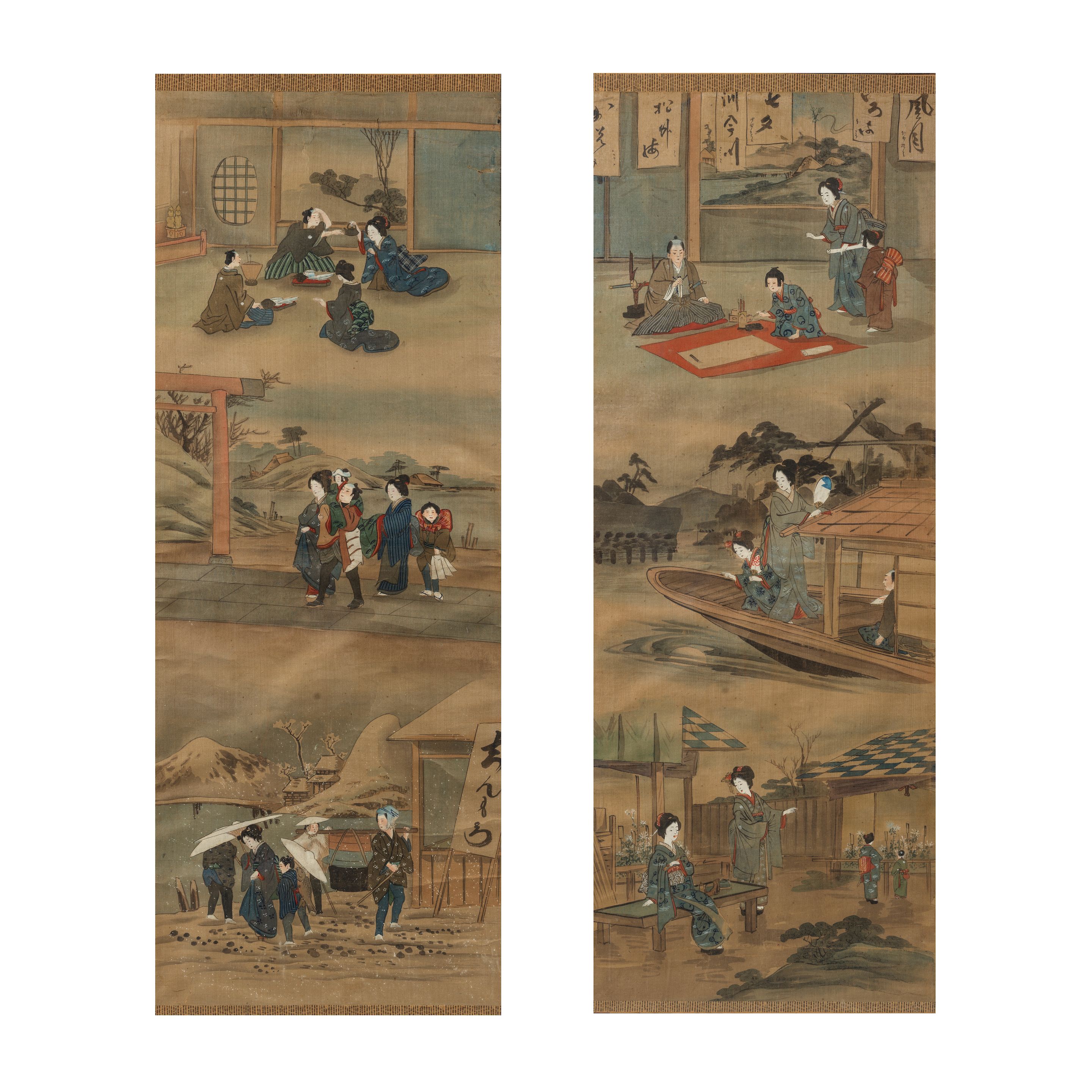 Painted in Kakiemon style with birds and flowering branches, crossed swords marks, a Meissen saucer, circa 1740, painted in purple with a scene of merchants by a quayside, within a baroque cartouche, crossed swords mark, a Meissen cup, circa 1770, painted with a couple on the shore observing a fleet, with blue ribbon border, crossed swords mark, a Mennency covered pot, circa 1760, the panelled body painted with floral sprays, incised DV mark, together with a Sevres style trembleuse cabinet cup, 19th century painted with a panel of flowers against a blue and gilt ground (6)