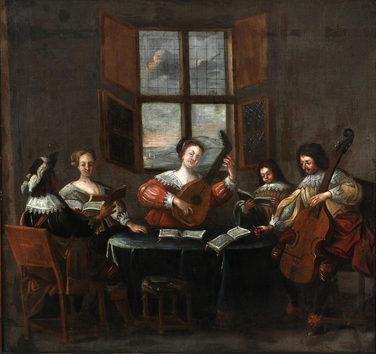 Interior with musicians around a table