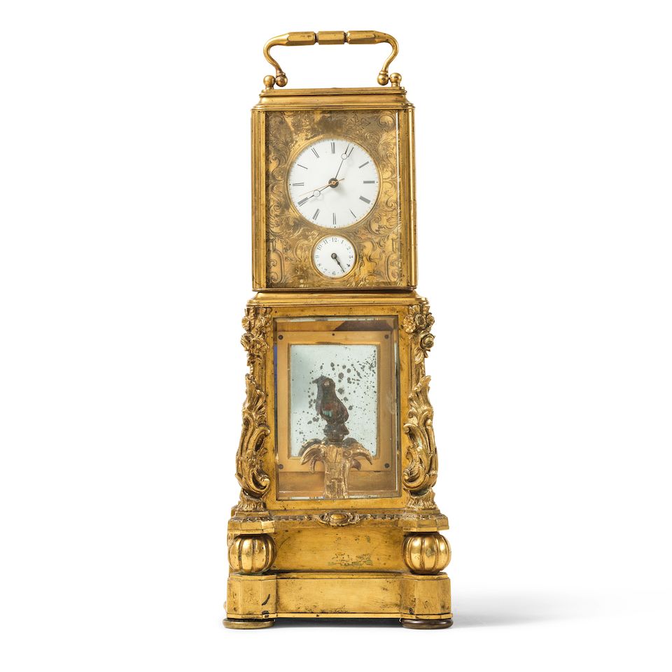 Rare pendule de voyage française à oiseau chanteur pour le marché chinois, milieu du X...