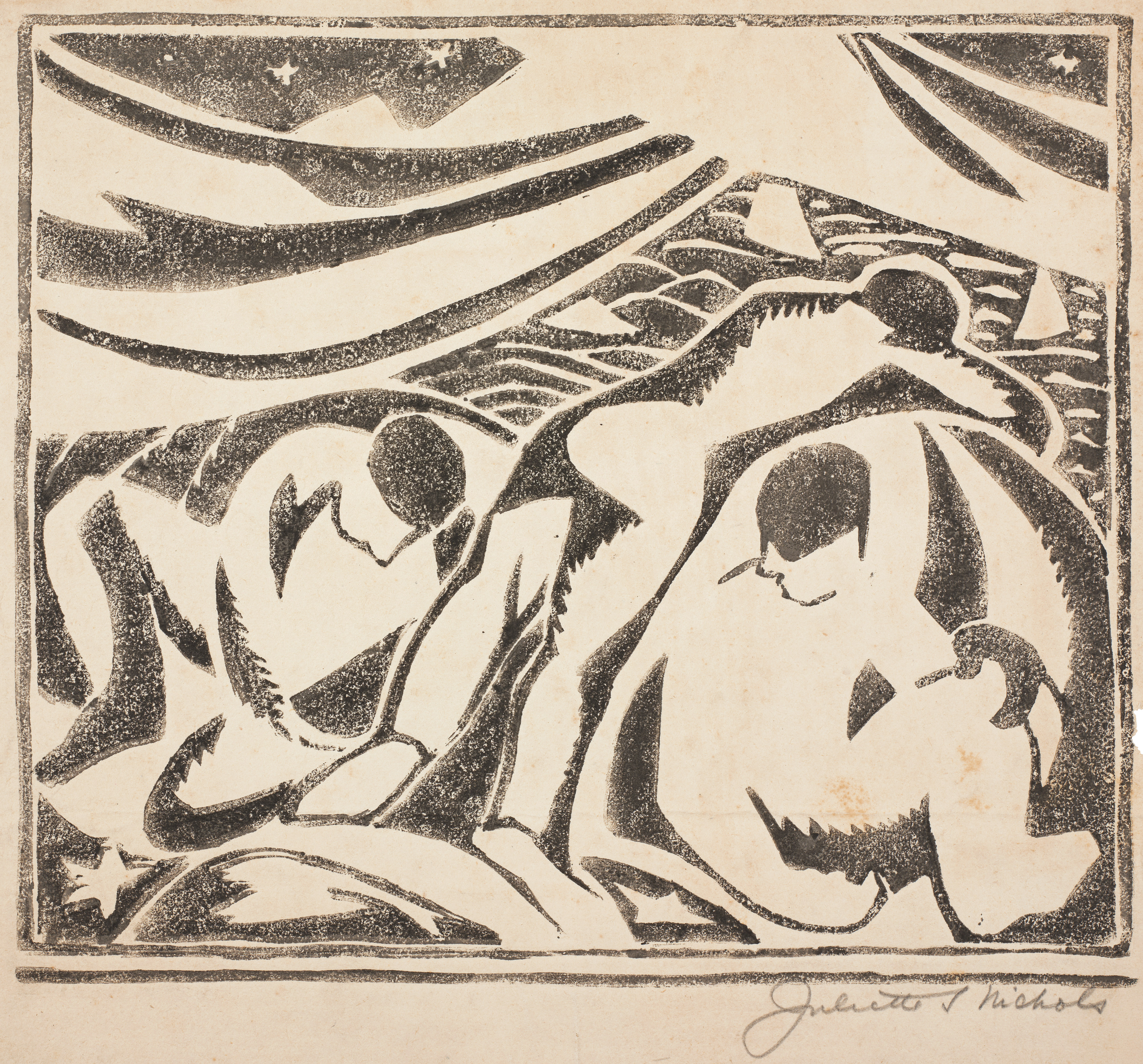 Unique white-line woodcut in colors, on laid paper, with mar...