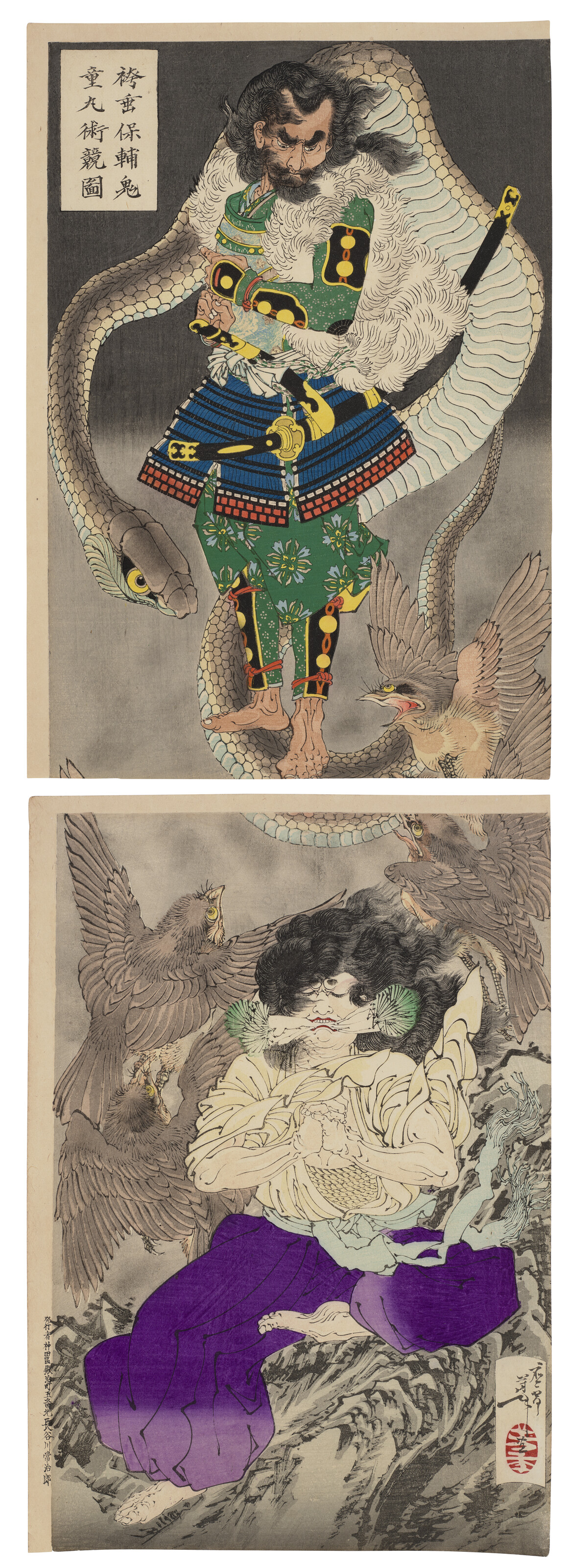 Group of Three Woodblock Prints, from the series Yoshitoshi's Courageous Wa...
