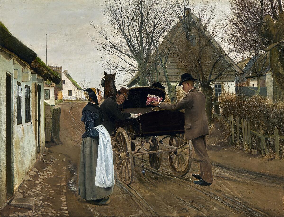 “Landsbygade. Slagteren sælger kød.” Village street in Vinderød