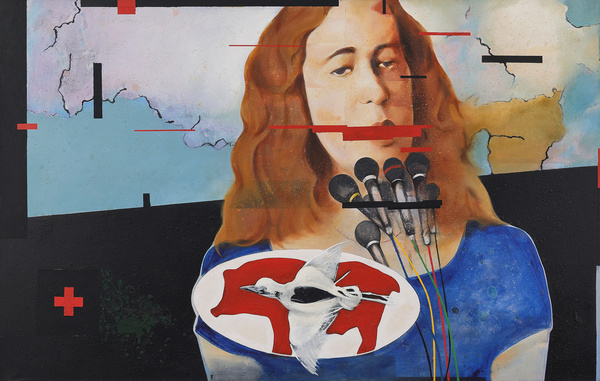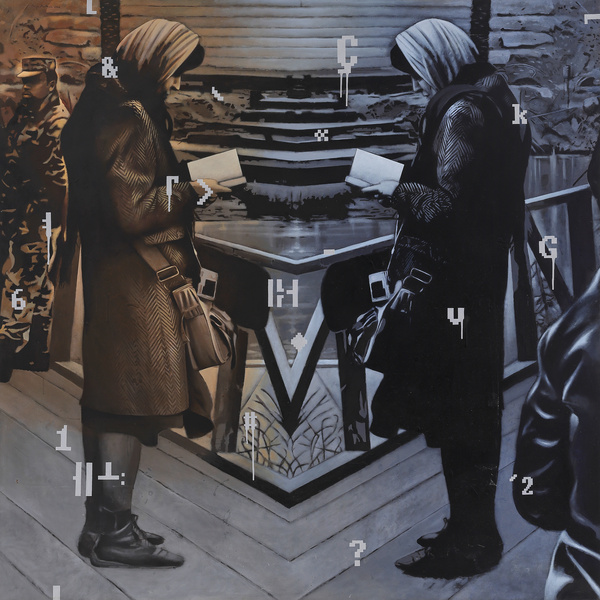 oil crayon, charcoal, graphite, tape, printed paper collage ...