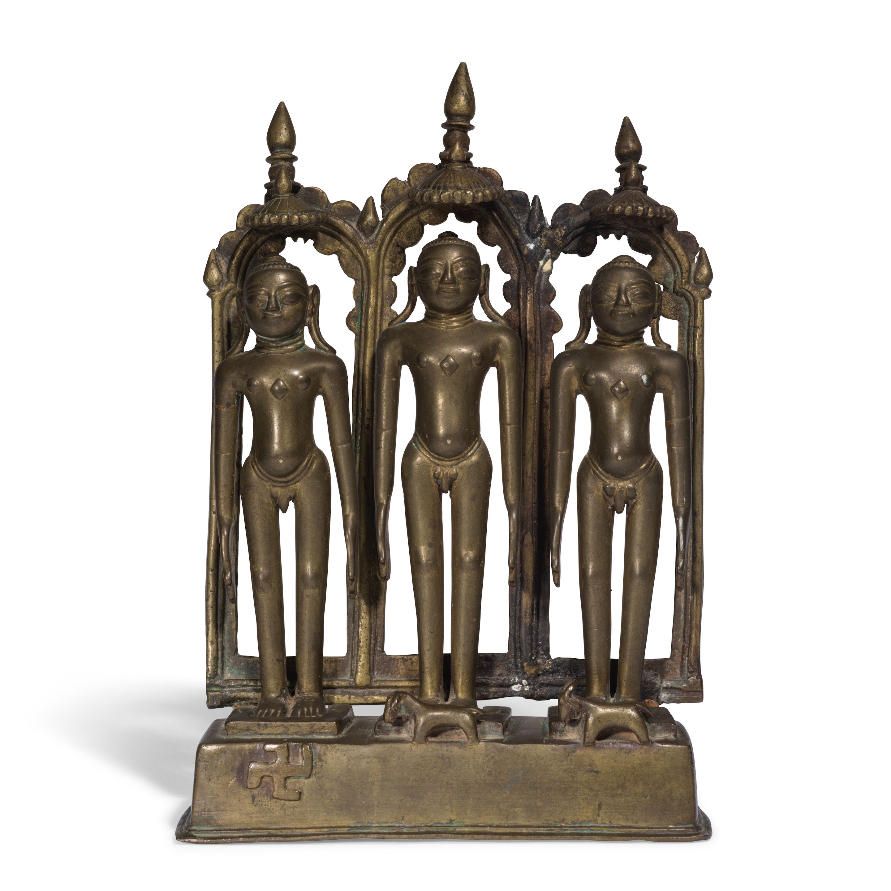 A JAIN BRONZE SHRINE REPREESENTING THREE TIRTHANKARAS