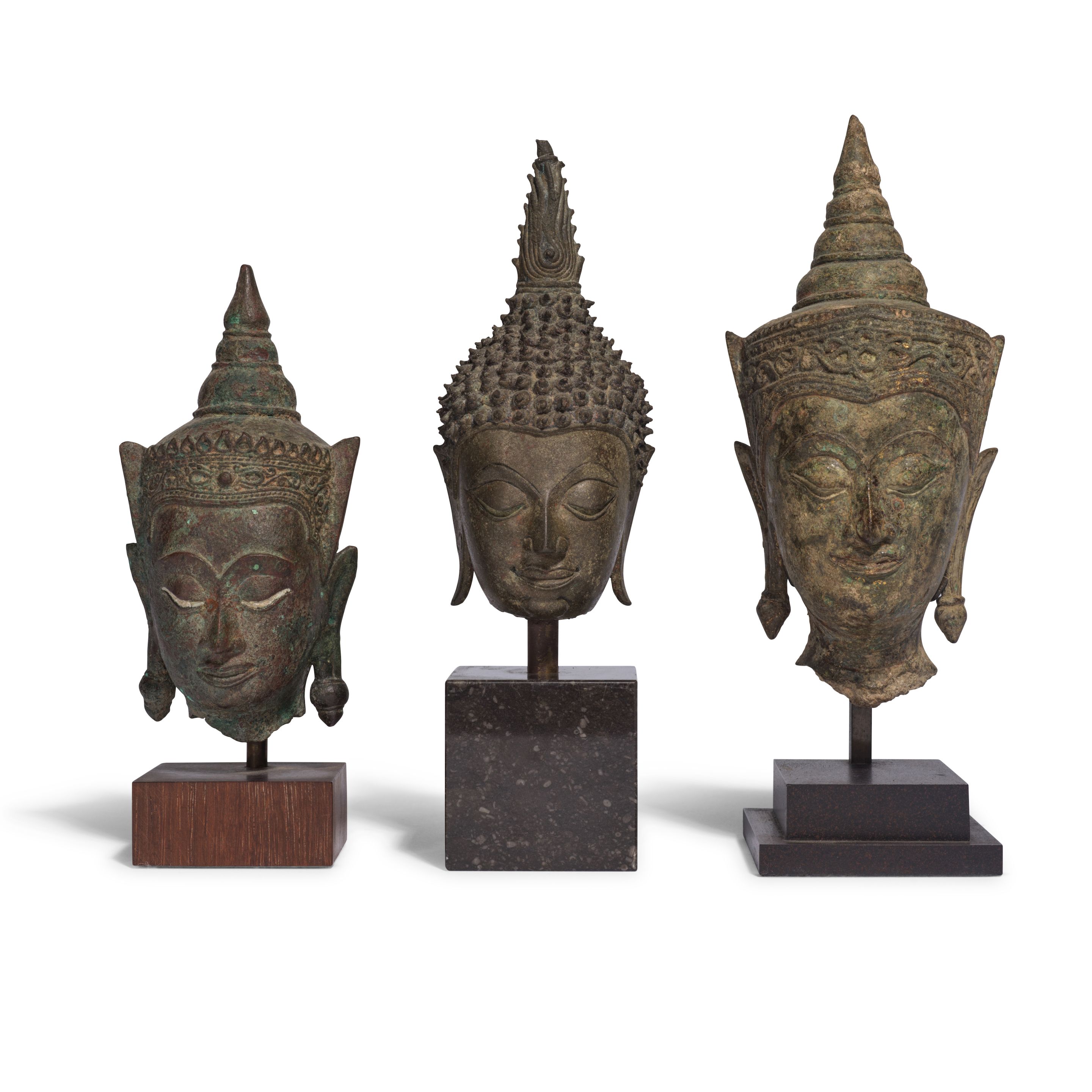 A GROUP OF THREE BRONZE BUDDHA HEADS