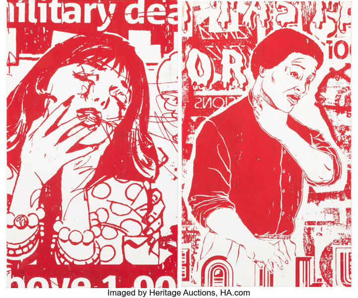 Screenprint in colors with spray paint hand-embellishments on Mohawk paper
