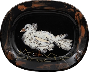white earthenware ceramic plate with black oxide, colored engobe and glaze