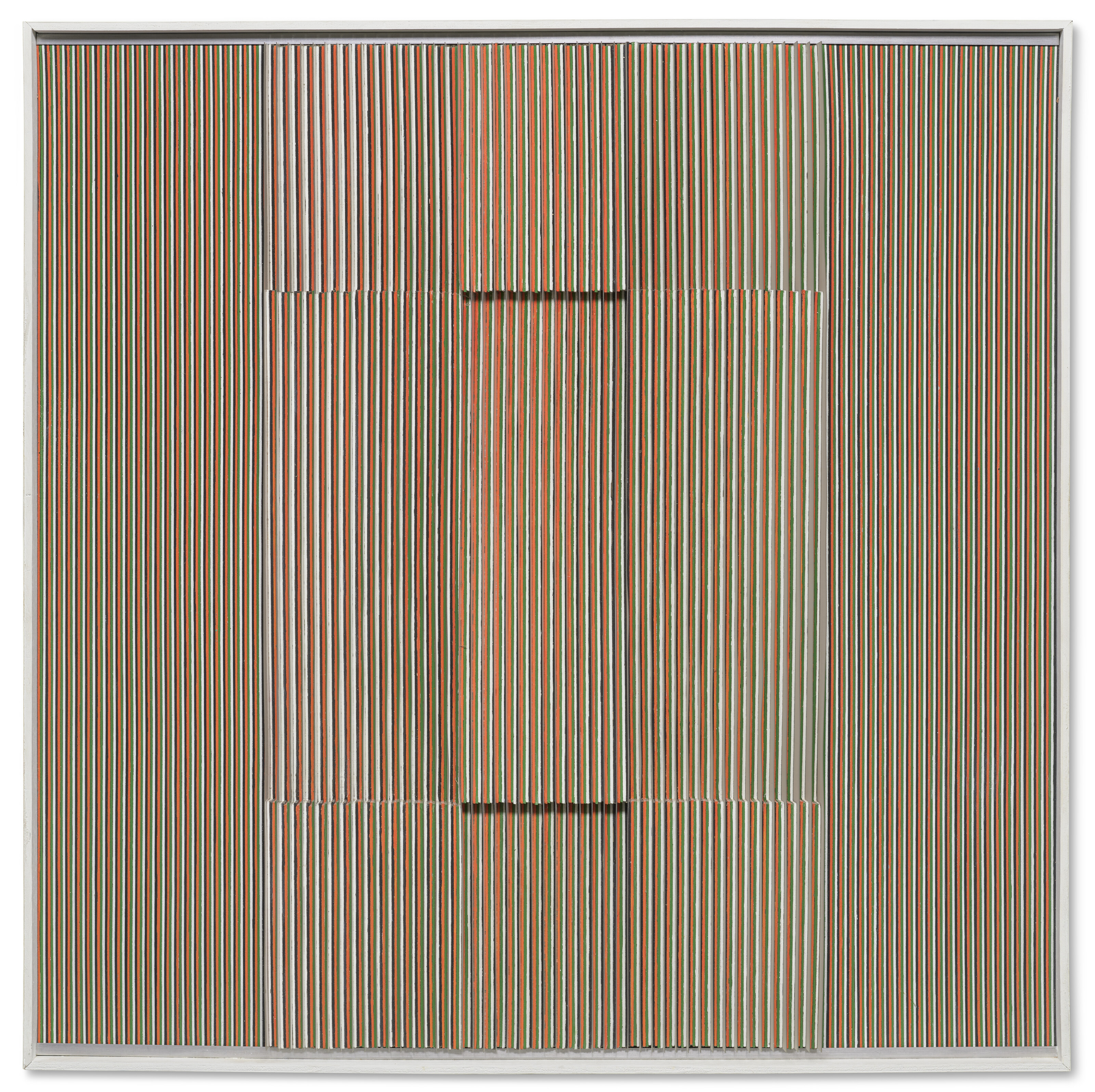 collage de bois découpé et peint, lamelles en plastique et aluminium sur panneau; dans un cadre d'artiste