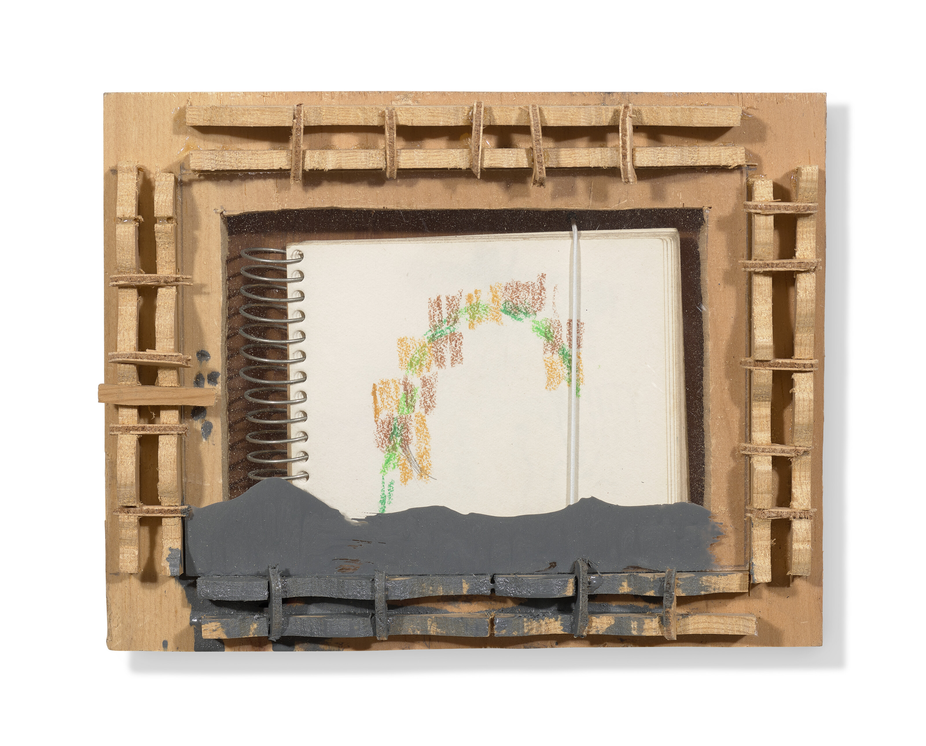 oil, graphite, colored pencil and string on sketchpad and Plexiglas wood box