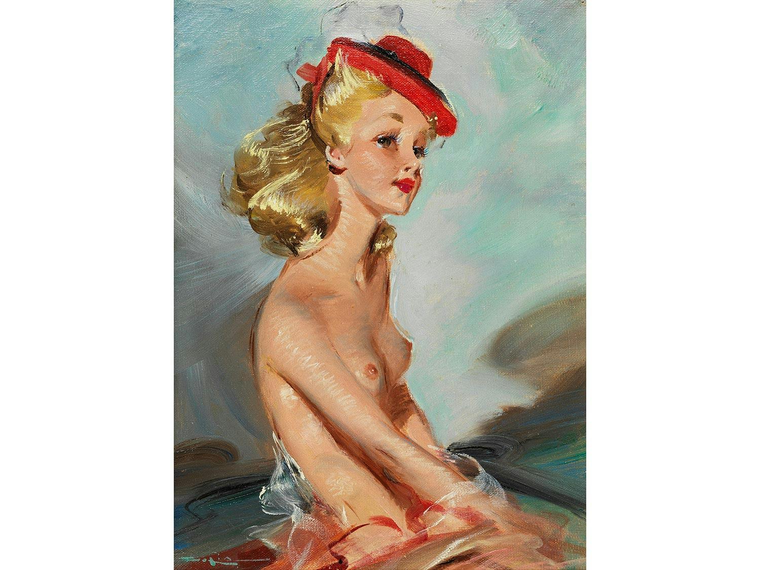 PORTRAIT EINER JUNGEN BLONDEN FRAU MIT ROTEM HUT