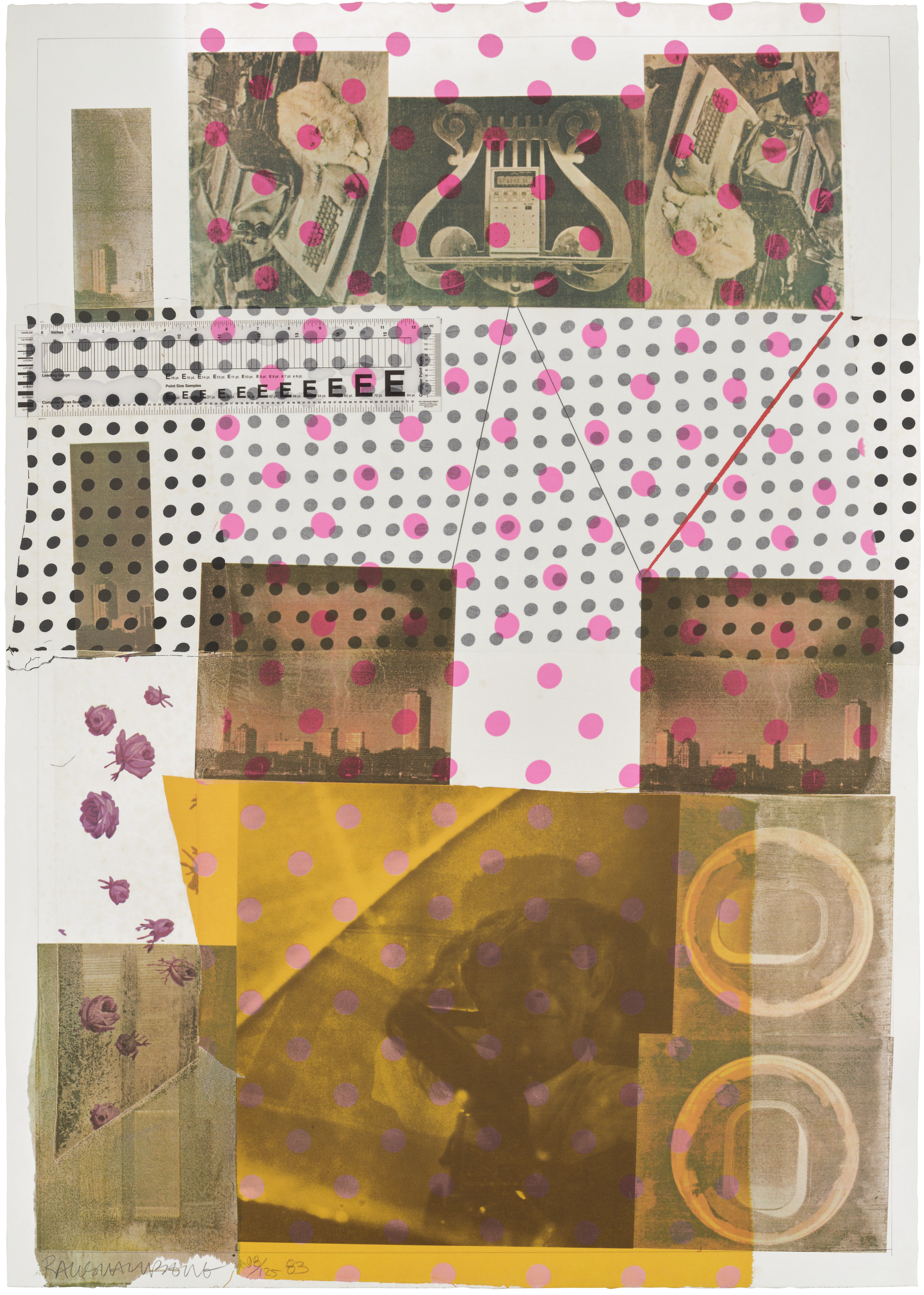 Screenprint in colors with fabric collage and plastic ruler, on wove paper, the full sheet