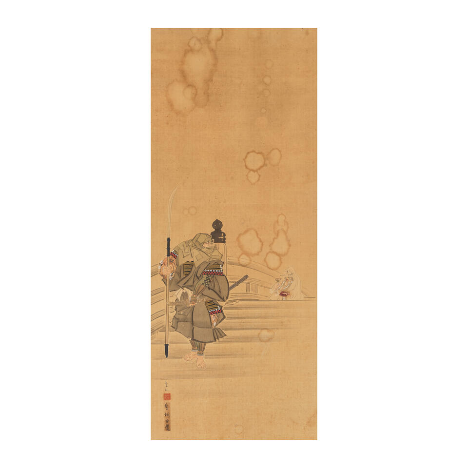 Ink and colours on silk, framed but not glazed, depicting the initial encounter of the warrior monk Benkei and the child-hero Yoshitsune (playing the flute) at the Gojō Bridge in Kyoto, unsigned