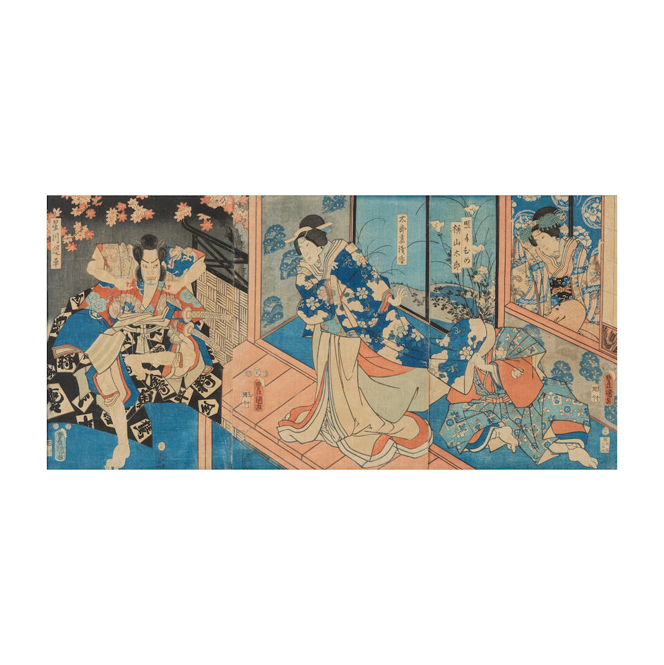 An ōban tate-e woodblock print triptych depicting the actors Iwai Kumesaburō III as Terutehime, Nakamura Fukusuke I as Yokoyama Tarō and Hoshikawa Unpei, and Nakamura Tomijūrō I as Tarō's wife Asaka in the play Kana kyōdai musume adauchi