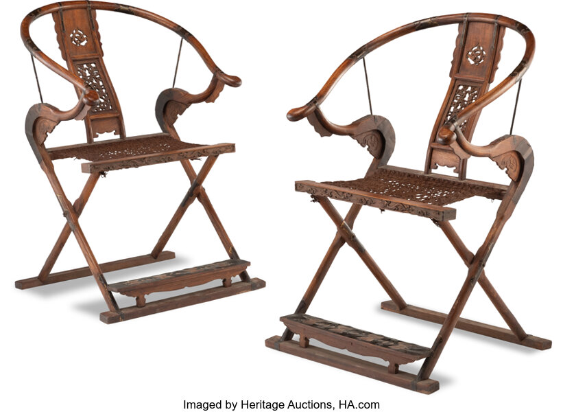 A Pair of Chinese Hardwood Horseshoe Back Folding Chairs