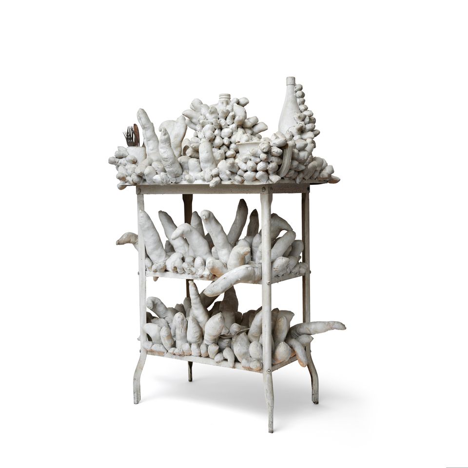 paint on stuffed and sewn fabric, metal shelf and manufactured objects