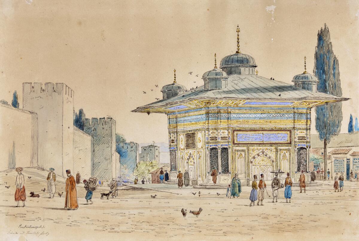 On the reverse, a sketch probably depicting the courtyard of the Beyazit Mosque