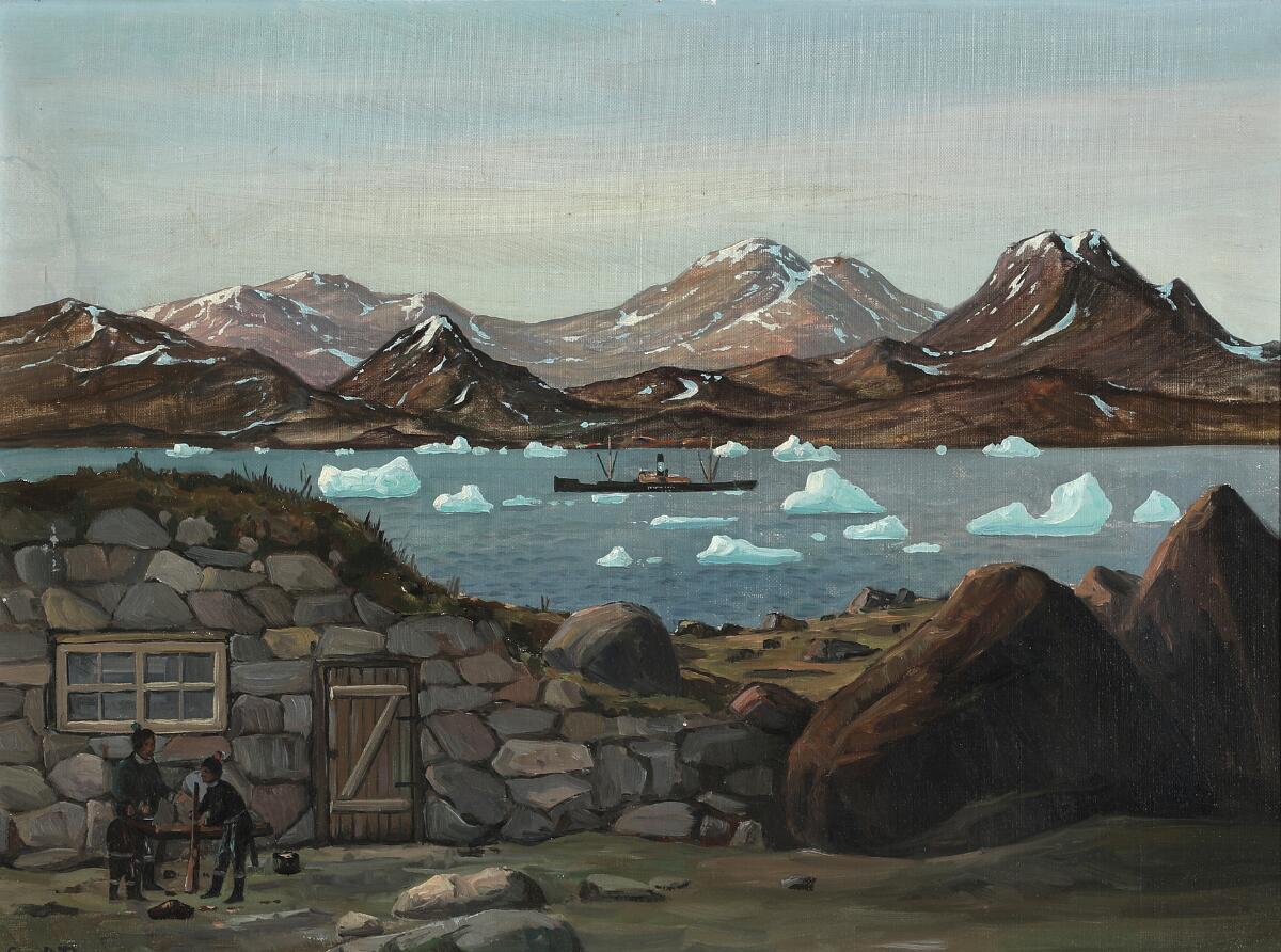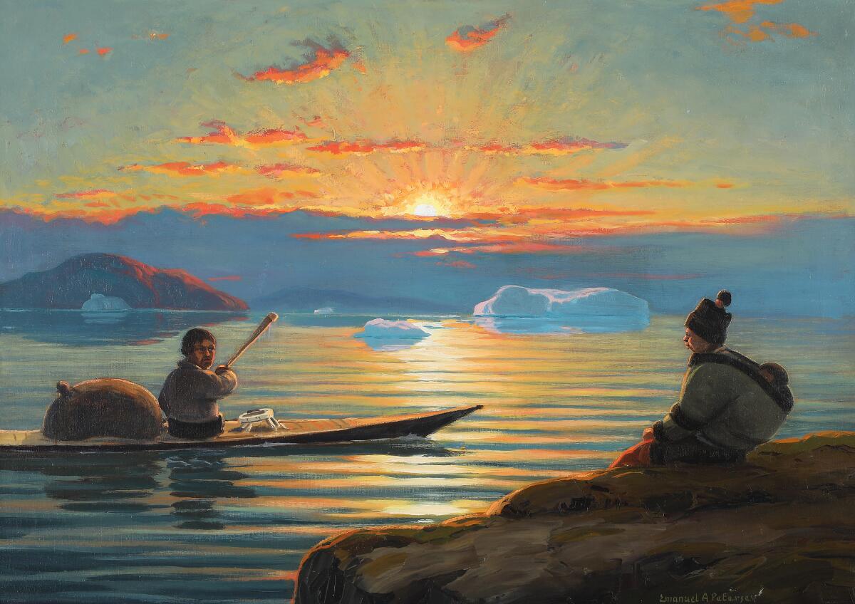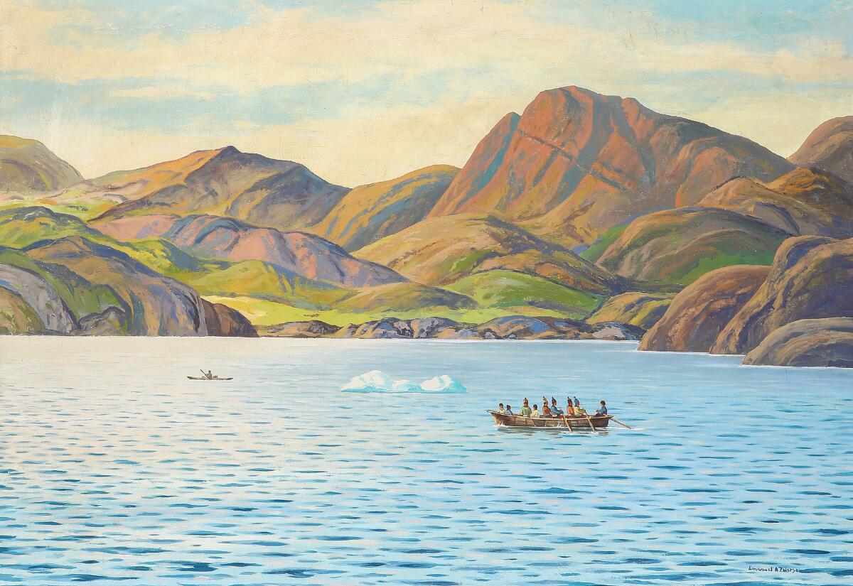 An umiak and kayak in the fiord at Angmagssalik, East Greenland