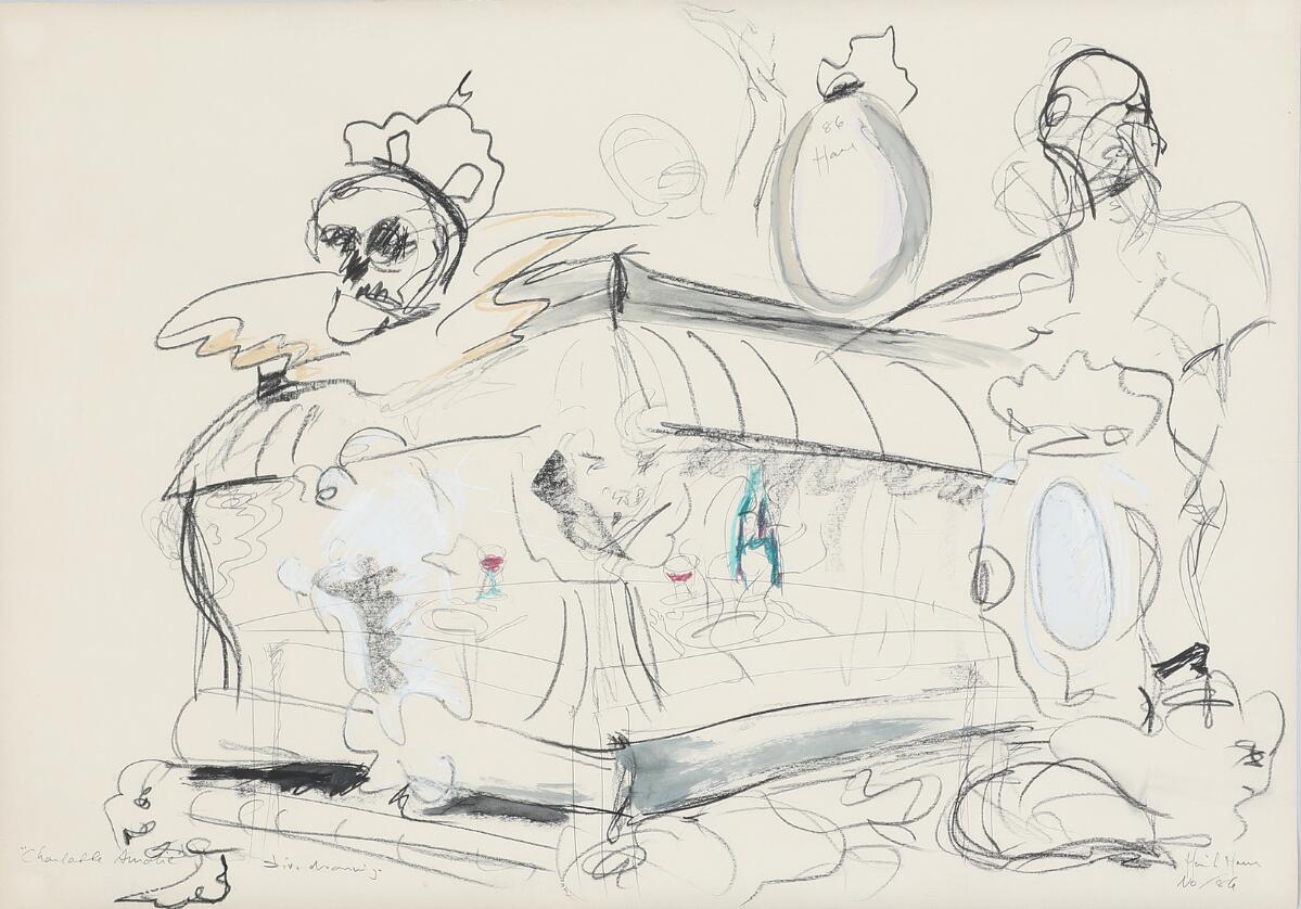 Pencil, oil pastel, charcoal and gouache on paper