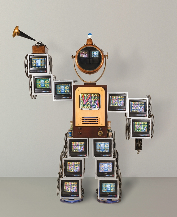 two-channel video, 2 USBs, 2 mini HD players, 15 televisions, neon tube, Edison standard phonograph, 4 Edison Diamond Discs, 15 phonograph cylinders, 22 film reels and various objects